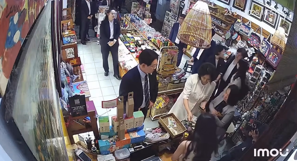 Chia sẻ về trên Tri Thức - Znews, chị Thu Trang - con gái của chủ cửa hàng lưu niệm cho biết, khoảng gần 19h tối ngày 23.4, khi vừa tiếp một nhóm khách ngoại quốc tới mua đồ, chị bỗng thấy một số vị khách lạ, mặc vest tiến vào. Chị nhanh chóng nhận ra đó là đoàn tùy tùng của Tổng thống Hàn Quốc Lee Jae Myung và phu nhân Kim Hae Kyung.