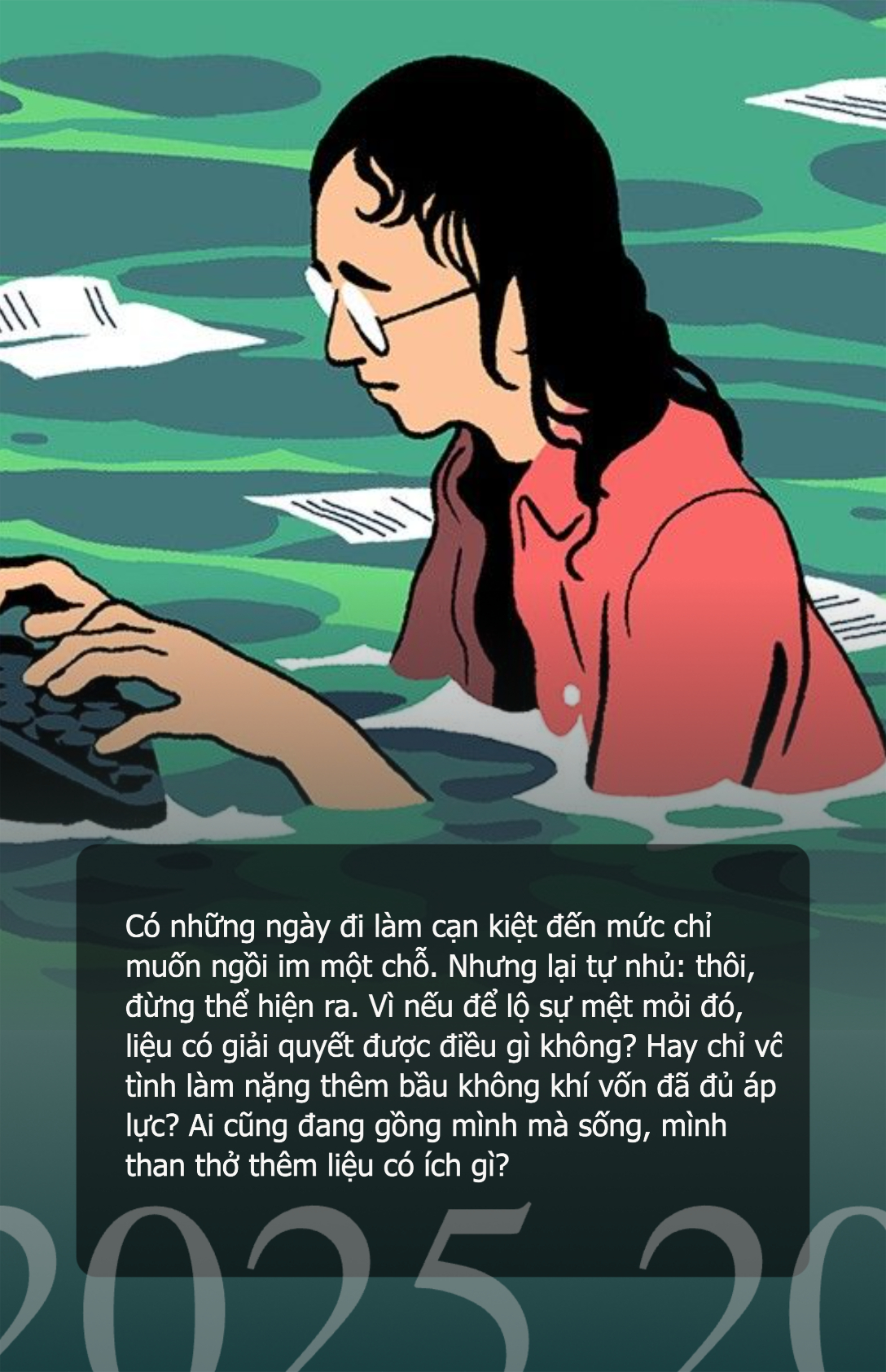 “Có cố được nốt tháng nữa không?” cứ neo mãi ở đó, trong tâm trí của những người mà nhìn từ bên ngoài, ai cũng nghĩ là rất ổn. Vẫn cười, vẫn tích cực, vẫn là người đưa ra ý tưởng mới trong các cuộc họp. Không ai biết được đâu. Chỉ chính họ mới hiểu, mình có thật sự ổn hay không.