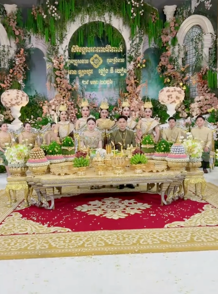 Bên cạnh những khoảnh khắc gia đình đầy cảm xúc, lễ cưới tại Campuchia còn gây ấn tượng mạnh bởi không gian mang đậm màu sắc văn hóa truyền thống bản địa. Rạp cưới của nhà trai được trang trí ngập tràn hoa tươi rực rỡ, sử dụng những gam màu tươi sáng tượng trưng cho sự sung túc, may mắn và lời chúc phúc dành cho đôi uyên ương.