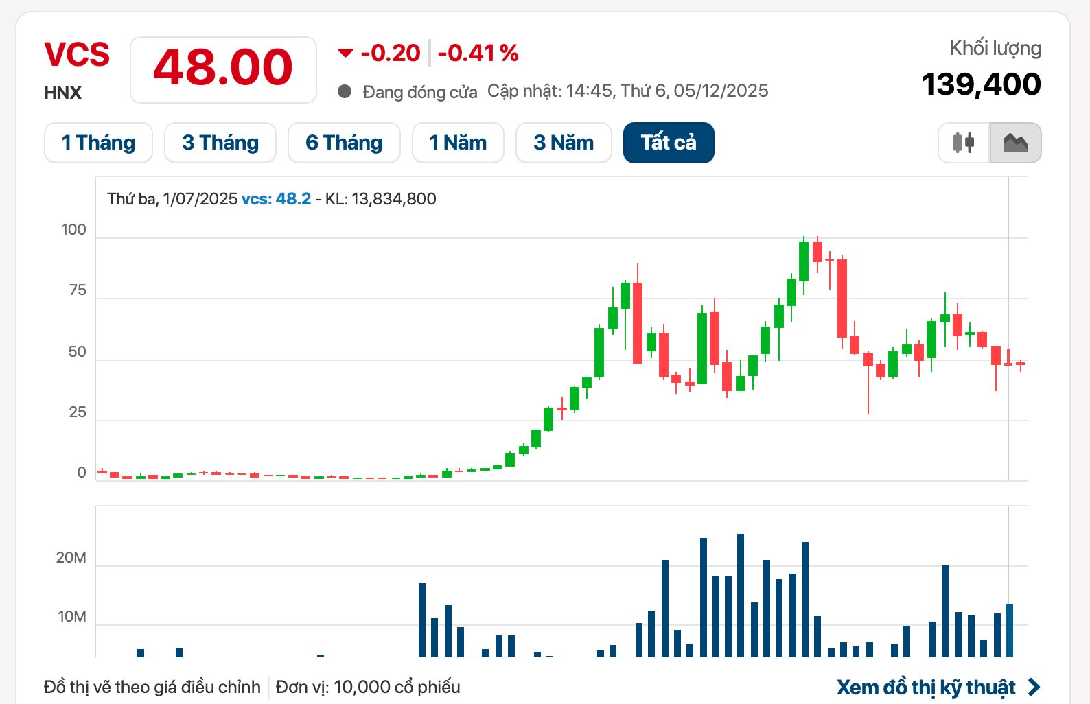 Trên thị trường chứng khoán, cổ phiếu VCS đang dừng ở mốc 48.000 đồng/cp.