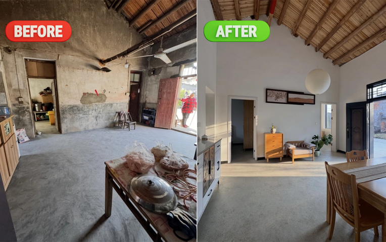 Một cô gái 32 tuổi ở Hồ Bắc đã dùng số tiền tích góp nhiều năm để mua lại một căn nhà cũ kèm sân vườn, diện tích khoảng 95m². Ban đầu, ngôi nhà xuống cấp nghiêm trọng, gần như không còn giá trị sử dụng. Thế nhưng chỉ sau nửa năm cải tạo, với chi phí khoảng 110.000 NDT (khoảng 400 triệu đồng), cô đã "thay da đổi thịt" toàn bộ không gian, biến căn nhà nông thôn cũ kỹ thành một tổ ấm ấm áp, dễ chịu, mang đậm hơi thở điền viên.