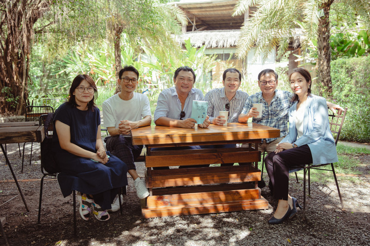 Hoa Trà (ngoài cùng, bên phải) trong cuộc gặp gỡ các nhà sản xuất, đạo diễn phim "Ngày xưa có một chuyện tình" và tác giả Nguyễn Nhật Ánh tại TP.HCM, hồi tháng 6/ 2023.