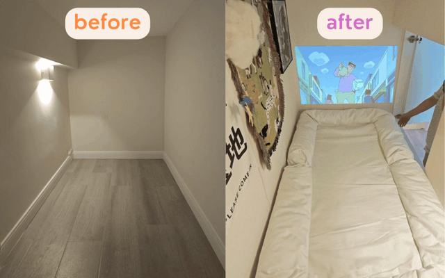 Ban đầu, chiếc tủ chỉ dùng để chứa quần áo và đồ linh tinh. Sau một lần dọn dẹp lớn, cô quyết định dọn sạch toàn bộ bên trong. Nhìn khoảng trống bỏ không, cô nảy ra ý tưởng cải tạo thành góc riêng của mình. Sau khi trao đổi với gia đình và nhận được sự ủng hộ, quá trình biến đổi bắt đầu. Cô trải một tấm thảm vừa vặn dưới đáy tủ để tạo cảm giác ấm áp. Xung quanh được dán đầy sticker hoạt hình theo sở thích cá nhân, vừa tạo điểm nhấn vừa giúp không gian trông sinh động hơn. Chi phí cho phần trang trí không cao nhưng hiệu quả thị giác khá rõ rệt.