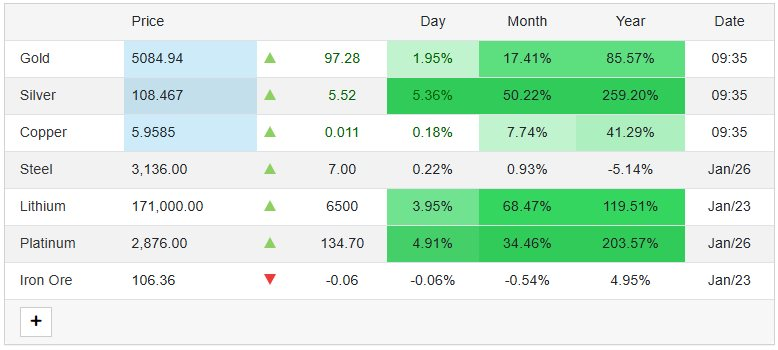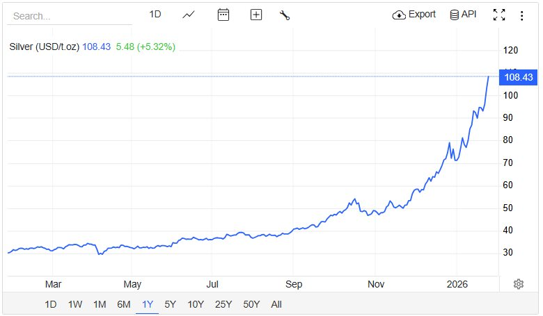 Trong khi nhà đầu tư bị thu hút bởi việc giá vàng lần đầu vượt 5.000 USD/ounce, giá kim loại anh chị em của nó cũng đang tăng vọt. Tính tới 9h38 theo giờ Hà Nội, bạc có giá kỷ lục 108 USD/ounce, tăng gần 260% so với cùng kỳ năm ngoái. Đây cũng là mức cao kỷ lục của giá bạc tính tới thời điểm hiện tại. Tại Việt Nam, bạc Phú Quý được bán ra với giá gần 113 triệu đồng/kg.
