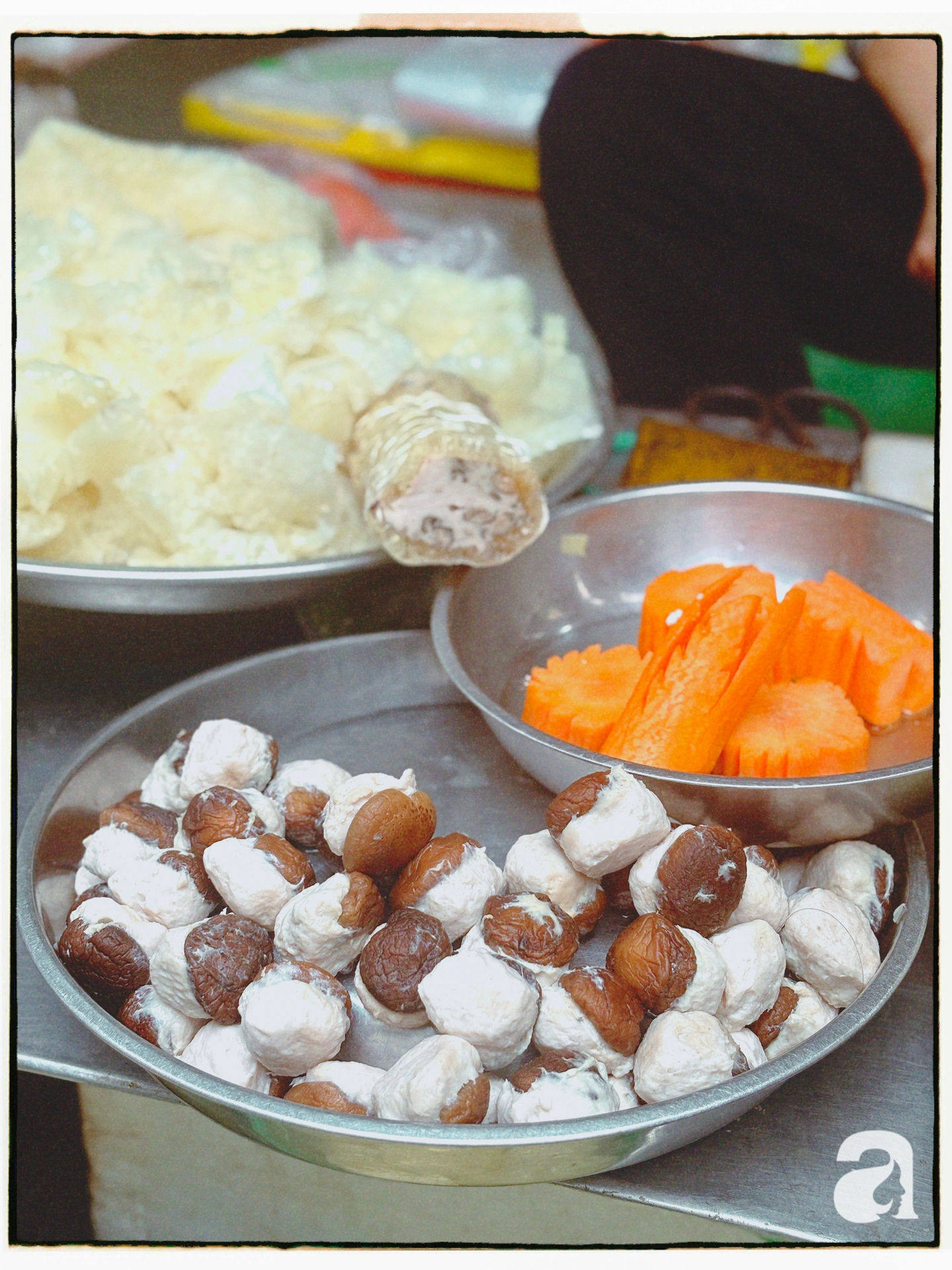 Nghe cô kể về các công đoạn để chuẩn bị cho món canh bóng mà thấy tỉ mỉ lắm. Giò sống chọn loại ngon nhất, bao từng cái nấm hương rồi hấp chứ không được luộc, để giữ trọn vị thịt ngọt lịm hòa quyện với hương nấm thoang thoảng. Trứng cút thì phải luộc, bóc vỏ rồi đem rán vàng. Rán trứng cút mà không có nghề thì cũng khó lòng để trứng nở vàng đều được.