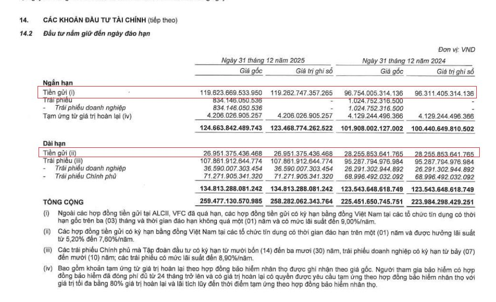 Cụ thể, ở kỳ hạn ngắn, tiền gửi đạt gần 119.624 tỷ đồng, tăng mạnh so với mức 96.754 tỷ đồng cuối năm 2024. Bên cạnh đó, Bảo Việt còn nắm giữ hơn 26.951 tỷ đồng tiền gửi dài hạn. Như vậy, tổng quy mô tiền gửi ngân hàng của tập đoàn này lên tới xấp xỉ 146.500 tỷ đồng, chiếm hơn một nửa tổng tài sản.