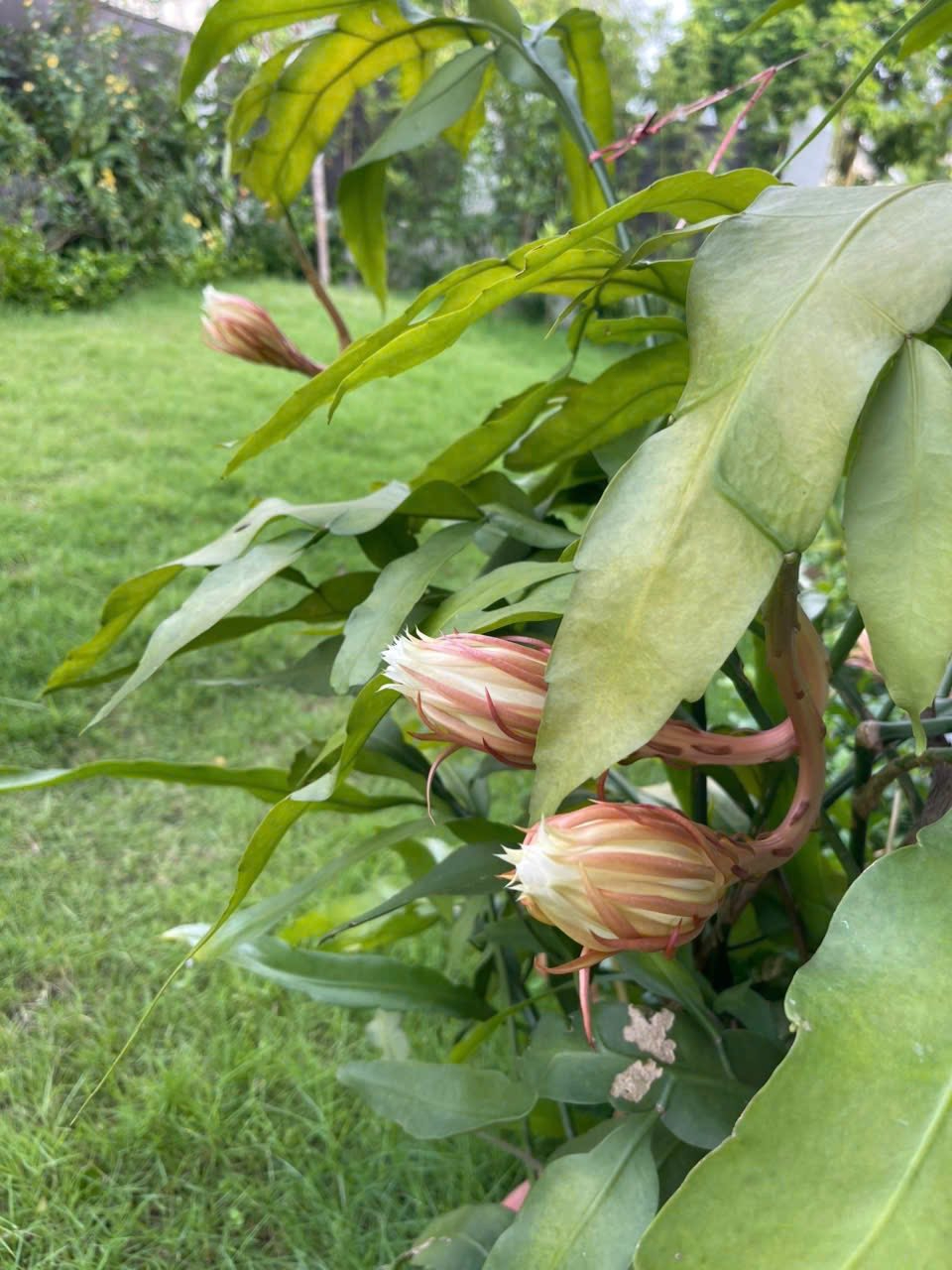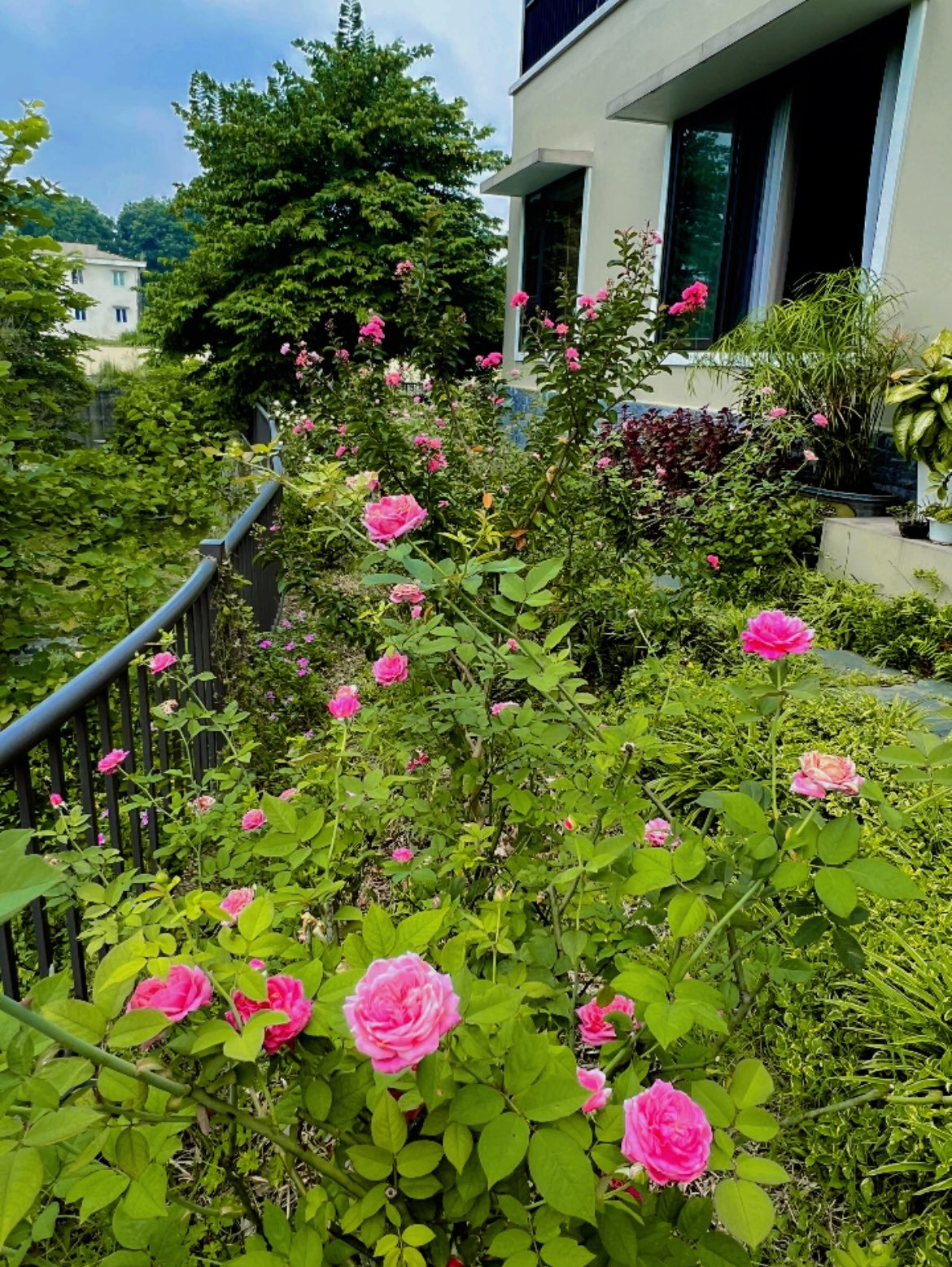 Khu vườn được chăm chút tỉ mỉ với nhiều loại cây và hoa. Đặc biệt, vườn của Diễm Quỳnh có rất nhiều hoa hồng. Những nhánh hồng leo vươn dài, trĩu nặng những nụ hoa hồng rực tạo nên một khung cảnh lãng mạn bao quanh lối đi.