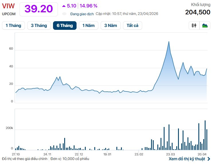 Mặt khác, phiên tăng trần của VIW diễn ra đúng thời điểm Viwaseen tổ chức ĐHĐCĐ thường niên 2026 tại Hà Nội (ngày 23/4). Theo tài liệu họp đã công bố, doanh nghiệp đặt mục tiêu doanh thu hợp nhất năm 2026 đạt 846 tỷ đồng, giảm 13,8% so với mức thực hiện năm 2025. Ngược lại, lợi nhuận trước thuế dự kiến đạt 52,4 tỷ đồng, tăng 37,5%.