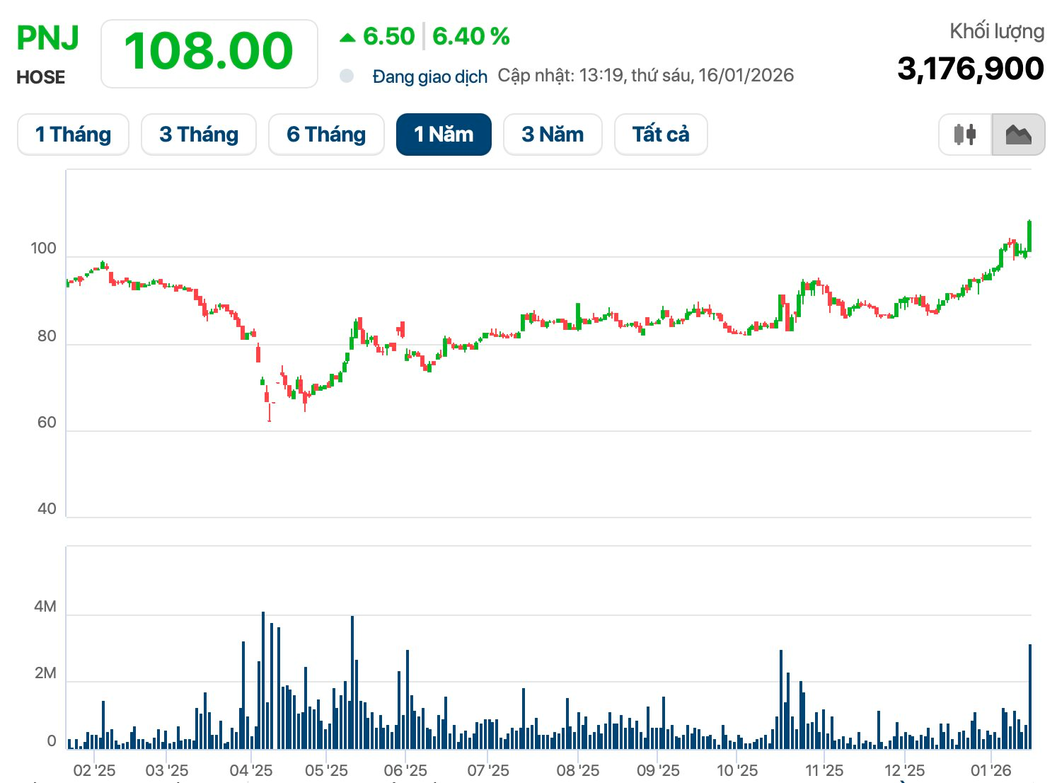 Sau một nhịp điều chỉnh ngắn, cổ phiếu PNJ nhanh chóng trở lại đà bứt phá. Phiên tăng “bốc đầu” ngày 16/1 đẩy thị giá PNJ vượt đỉnh lịch sử. Vốn hóa cũng theo đó lập kỷ lục 37.000 tỷ đồng. Chỉ trong vòng 1 tháng trở lại đây, giá trị thị trường của “đại gia” bán lẻ vàng, bạc, trang sức lớn nhất sàn chứng khoán đã tăng 25%.