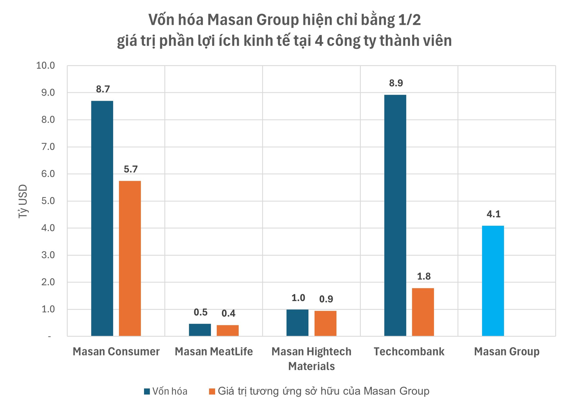 Hiện vốn hóa Masan Group chỉ ở mức 4,2 tỷ USD trong khi phần sở hữu tại Masan Consumer, Masan Meatlife, Masan Hightech Materials và Techcombank có trị giá tới gần 9 tỷ USD, chưa kể Wincommerce.
