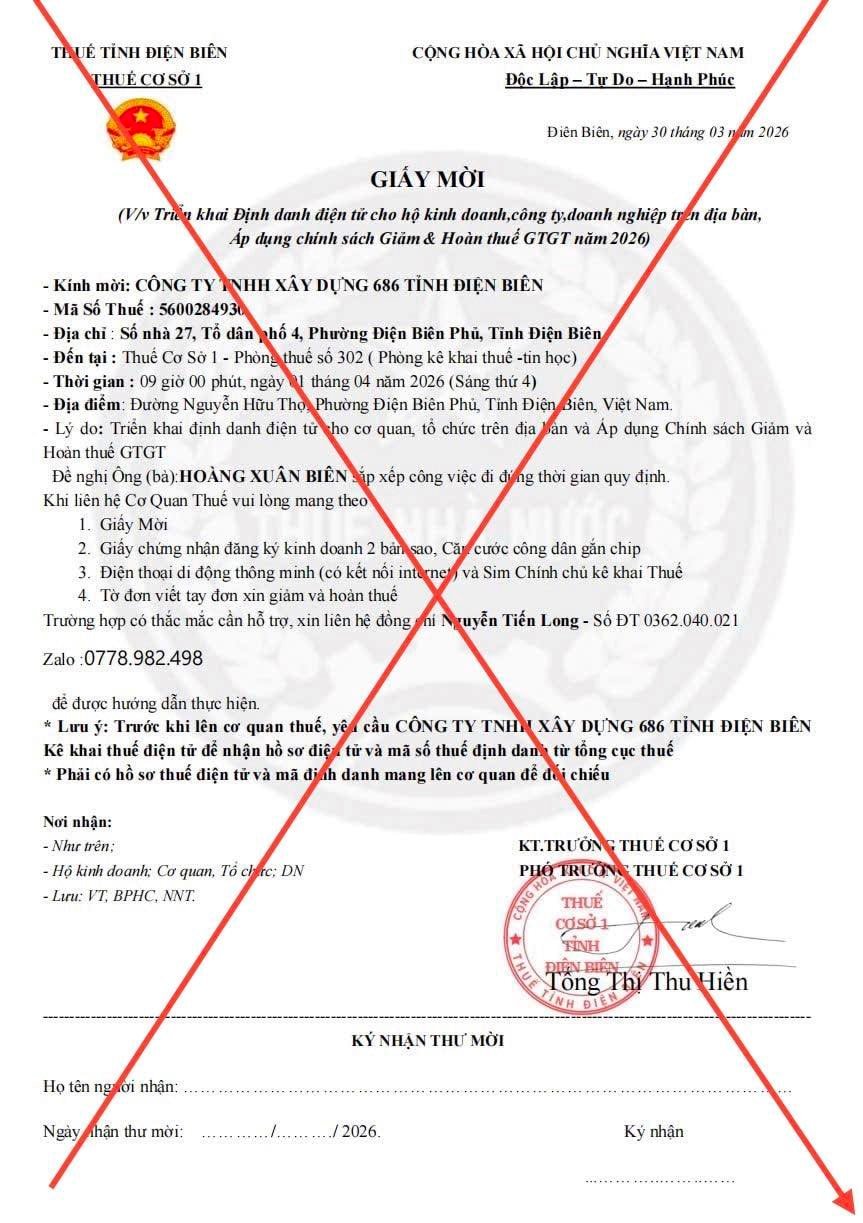 Thuế cơ sở 1 tỉnh Điện Biên cho biết, thời gian gần đây xuất hiện tình trạng các đối tượng giả mạo “giấy mời” của cơ quan thuế gửi đến doanh nghiệp, hộ kinh doanh nhằm lừa đảo, chiếm đoạt tài sản.