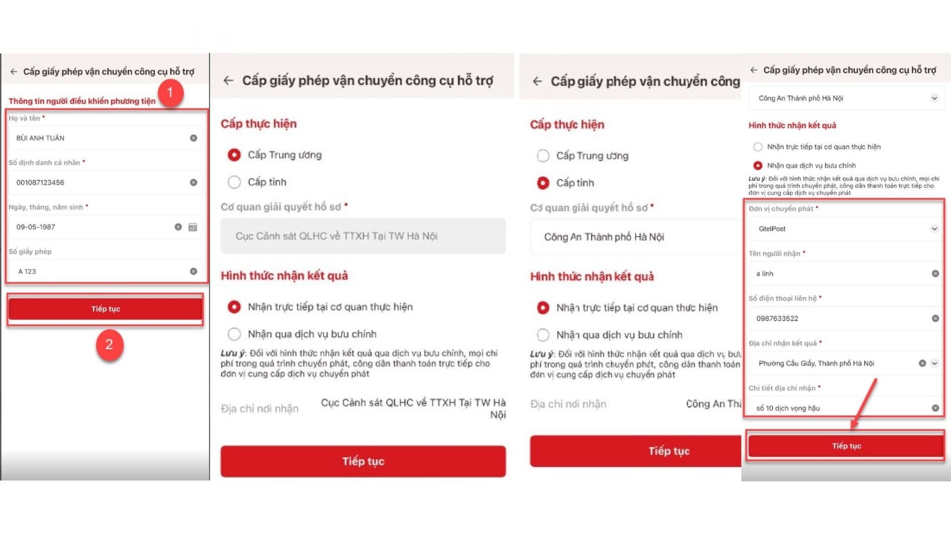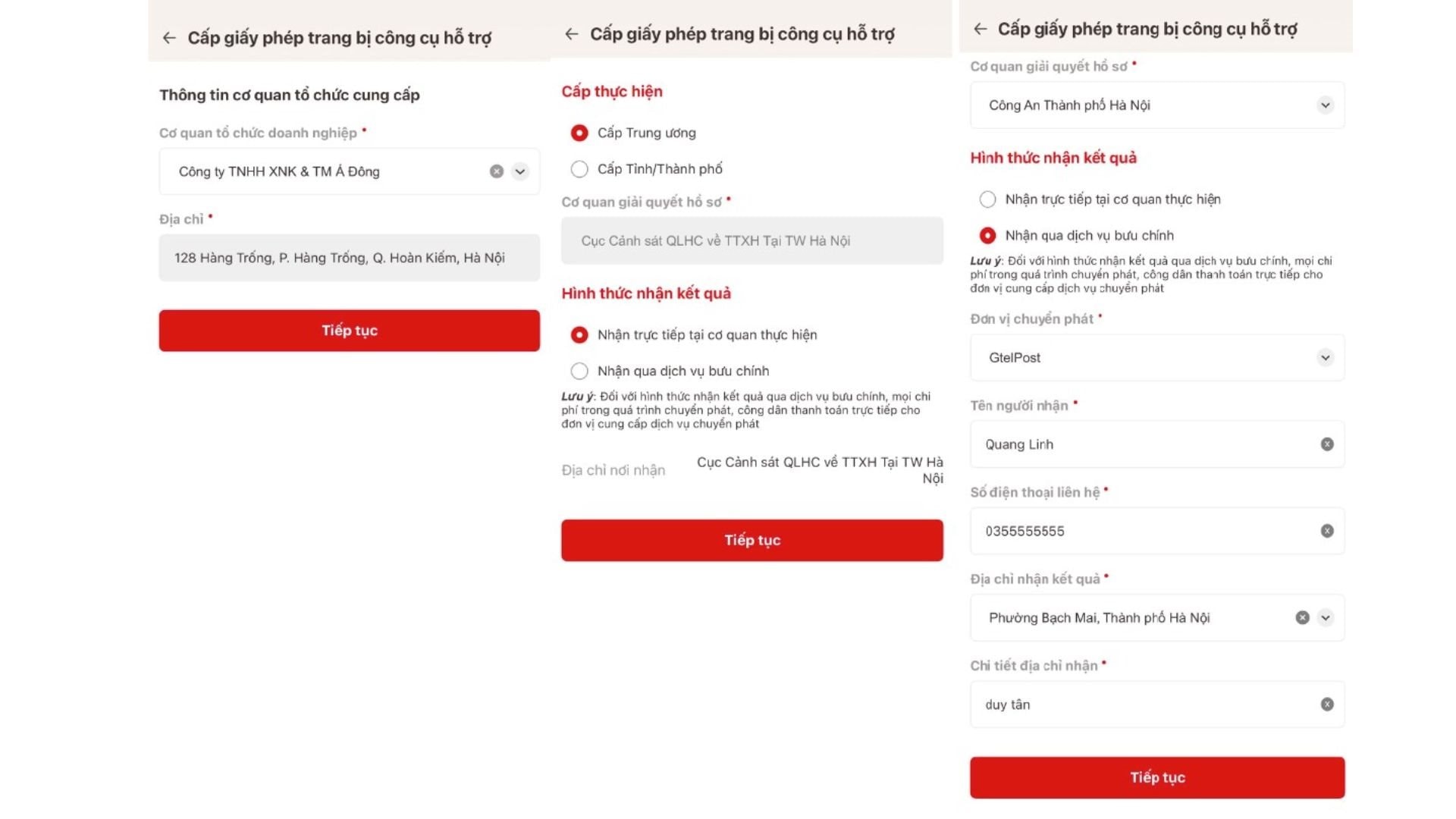 Lựa chọn một trong hai hình thức nhận kết quả: nhận trực tiếp tại cơ quan giải quyết; nhận qua dịch vụ bưu chính. Sau khi hoàn tất các thông tin, nhấn "Tiếp tục".