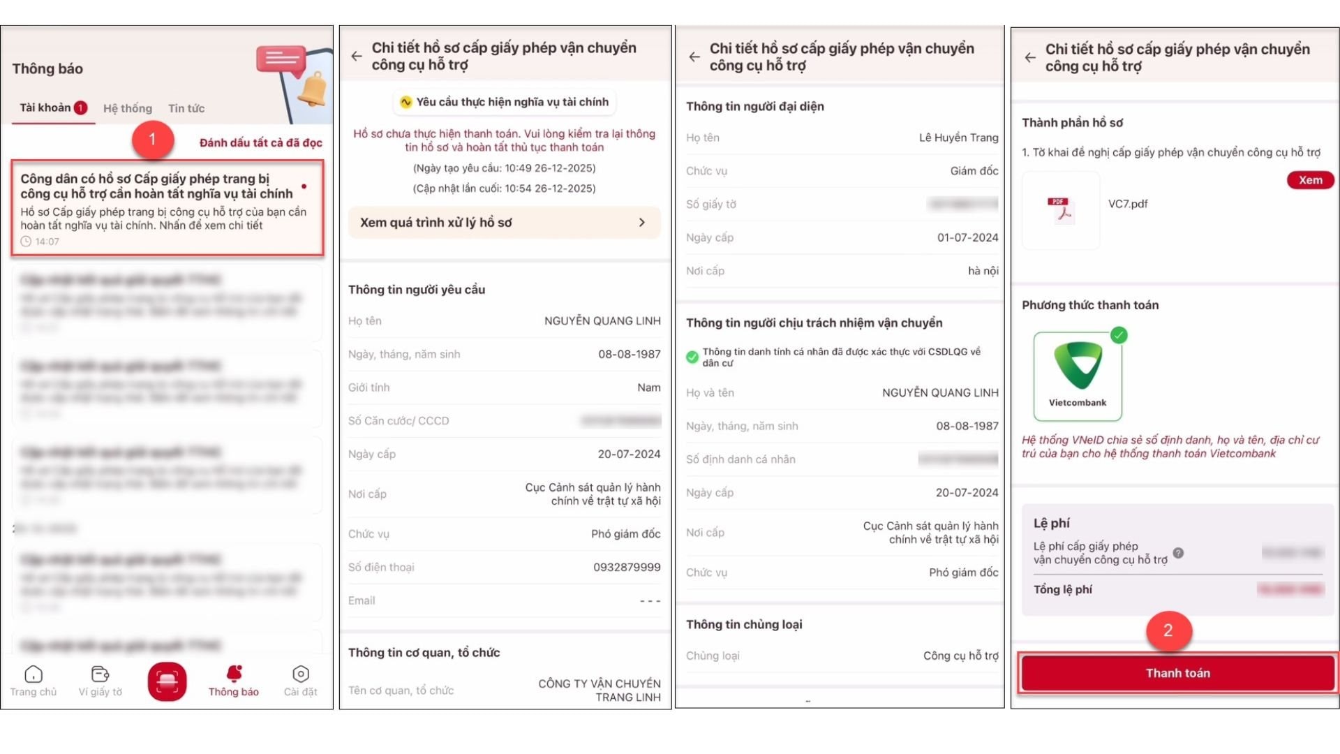 Sau khi gửi hồ sơ thành công, người dân có thể theo dõi lịch sử yêu cầu, thực hiện thanh toán nghĩa vụ tài chính và nhận kết quả ngay trên ứng dụng VNeID.