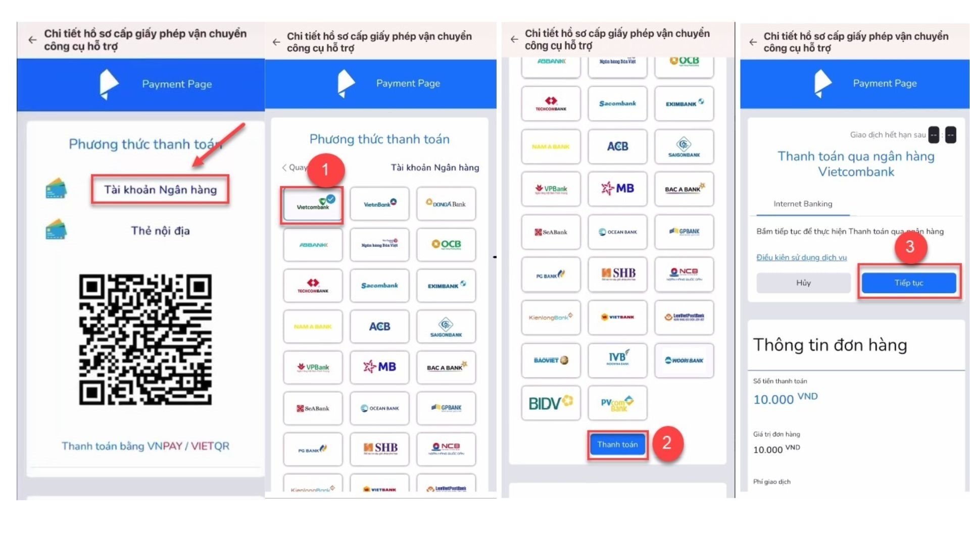 - Bước 3: Lựa chọn phương thức thanh toán gồm: tài khoản ngân hàng; thẻ nội địa; thanh toán qua VNPAY hoặc VietQR.