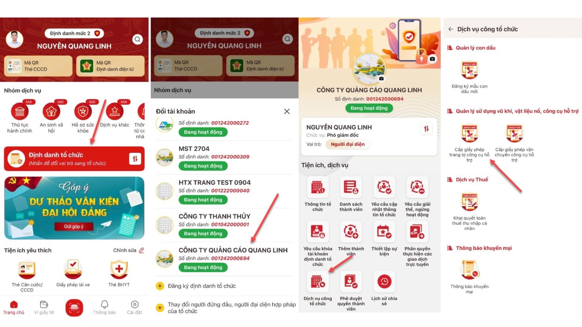 - Bước 1: Đăng nhập tài khoản VNeID mức 2, chọn "Định danh tổ chức" và chọn tổ chức cần xin cấp phép.