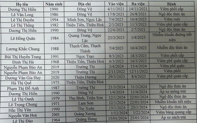 Danh sách 20 hồ sơ bệnh án khống tại Bệnh viện đa khoa TP Thanh Hóa (nay là Bệnh viện đa khoa Hạc Thành).