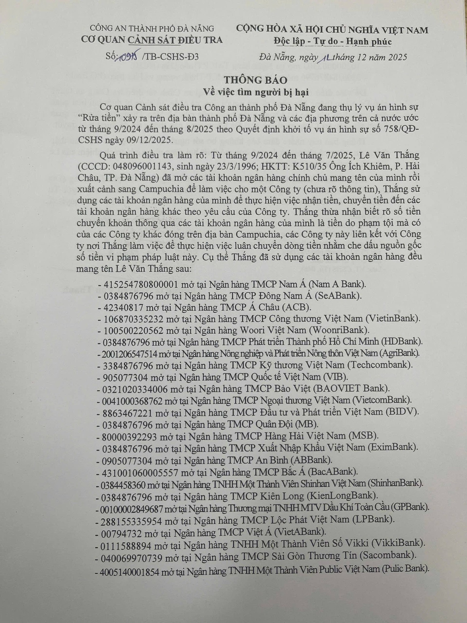Theo hồ sơ điều tra, trong khoảng thời gian từ tháng 9/2024 đến tháng 7/2025, Lê Văn Thắng (29 tuổi, trú Tổ 31, phường Hải Châu 1, quận Hải Châu, Đà Nẵng) đã mở nhiều tài khoản ngân hàng chính chủ. Sau đó, Thắng xuất cảnh sang Campuchia làm việc cho một công ty chưa rõ thông tin.