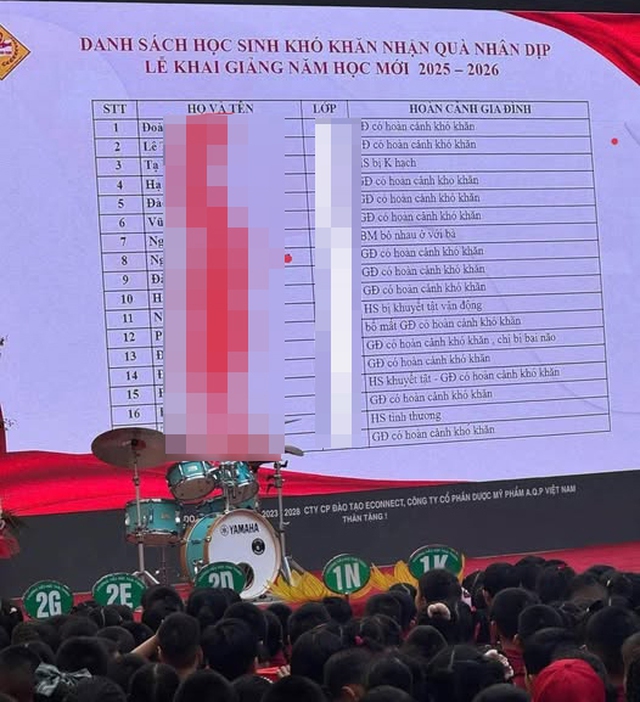 Ngày 6/9, cộng đồng mạng chia sẻ hình ảnh và thông tin sự việc một trường tiểu học trên địa bàn Hà Nội đã công khai danh sách học sinh khó khăn trên màn hình Led lớn. Màn hình này được chiếu trước toàn bộ phụ huynh và học sinh toàn trường, ghi rõ hoàn cảnh của các em nhỏ khi nhận phần quà hỗ trợ.