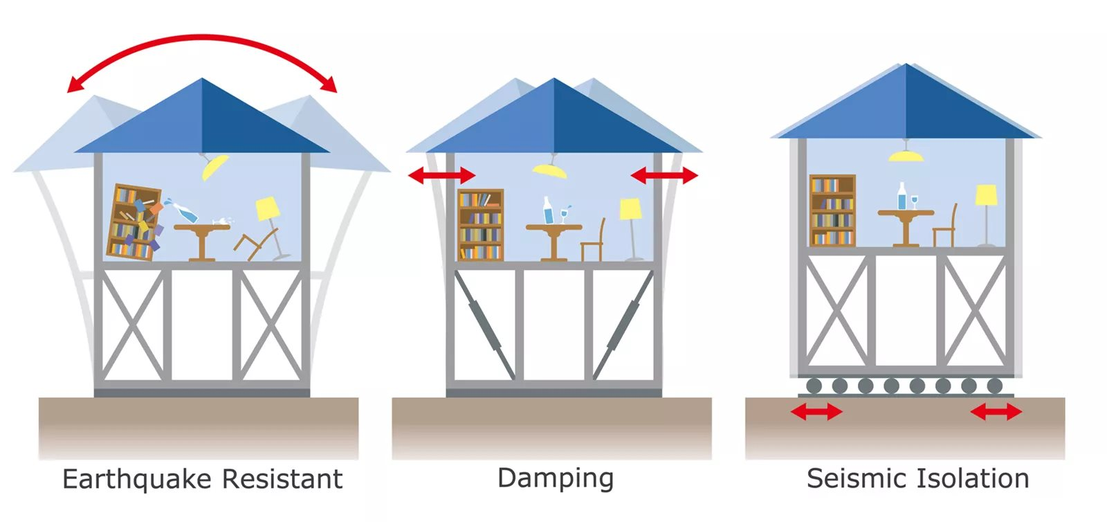 Kỹ nghệ giảm chấn của Nhật Bản được phân cấp rõ rệt dựa trên cơ chế đối phó với lực tác động từ động đất và gió.