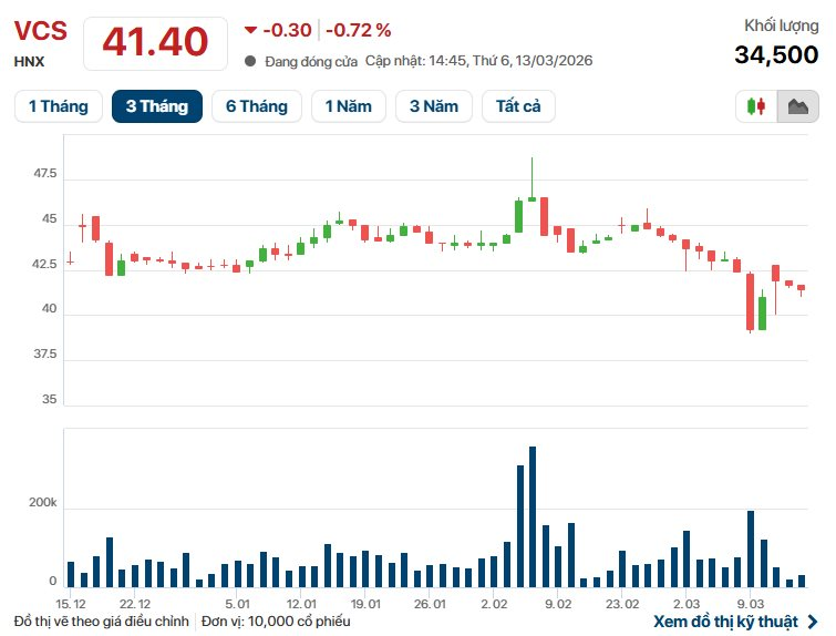 Kết phiên giao dịch 13/3, cổ phiếu VCS có giá là 41.400 đồng/cp. Vốn hoá thị trường đạt 6.600 tỷ đồng.
