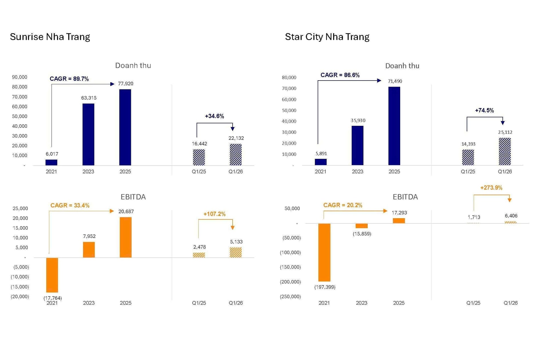 Song song với đó, các tài sản vận hành tại Nha Trang tiếp tục chứng minh sức mạnh của chiến lược cải thiện hiệu quả hoạt động qua 2 khách sạn 5 sao tại Nha Trang. Cụ thể, khách sạn StarCity Nha Trang với tên gọi mới Starcity Bayfont Nha Trang sau quá trình nâng cấp và tái định vị đã đạt được tăng trưởng doanh thu, công suất phòng vượt trội và lợi nhuận hoạt động gộp tăng 97% so với cùng kỳ, vượt 60% kế hoạch năm. Khách sạn Sunrise Nha Trang Beach Hotel & Spa ghi nhận lợi nhuận gộp tăng 32% so với cùng kỳ và vượt 29% kế hoạch năm.