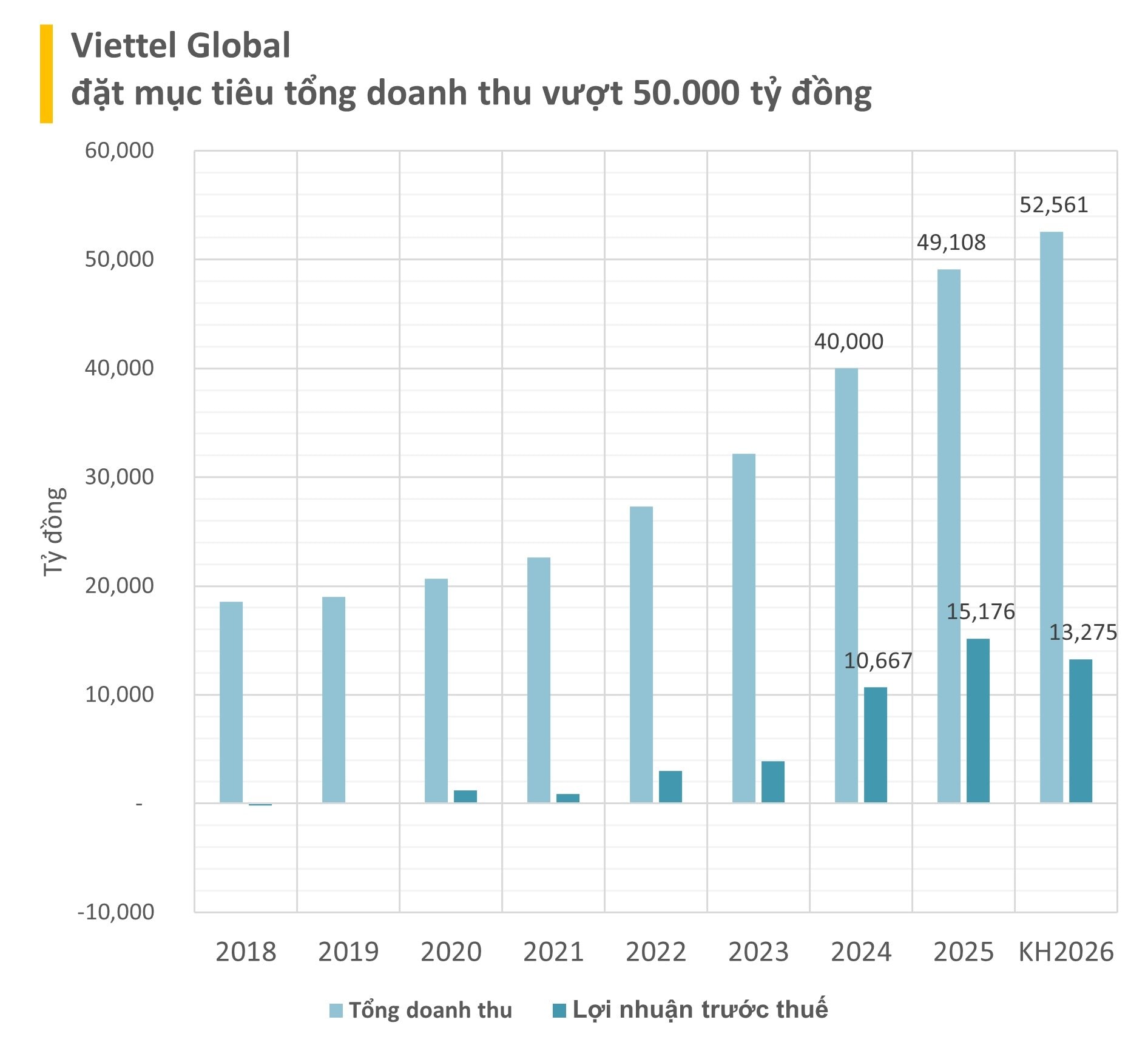 Viettel Global đặt mục tiêu doanh thu hợp nhất năm 2026 đạt 52.561 tỷ đồng, tăng 7% so với năm trước và nếu hoàn thành sẽ lập kỷ lục mới.