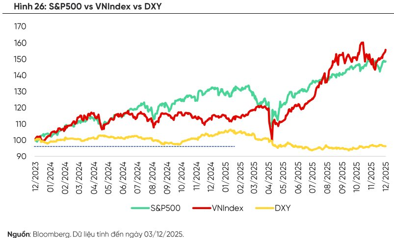 Thống kê lịch sử cho thấy VN-Index có xu hướng vượt trội so với S&P 500 trong những giai đoạn DXY suy yếu. Trong bối cảnh quan điểm đồng thuận về đồng USD năm 2026 sẽ suy yếu, điều này mang lại triển vọng tương đối tích cực cho VN-Index trong năm 2026.