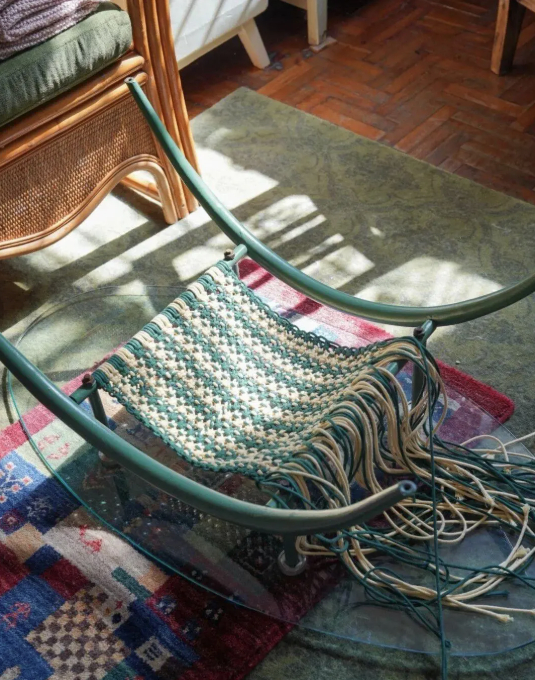Chiếc bàn trà thực ra là món đồ cũ đã bị bỏ đi. Phần chân bàn từng bị rỉ sét và lỏng lẻo, tưởng như không thể dùng lại. Thay vì bỏ đi, cụ bà đã mang về sửa lại. Bà gia cố phần khung, sau đó quấn dây thừng quanh chân bàn để vừa che khuyết điểm vừa tạo cảm giác mộc mạc.