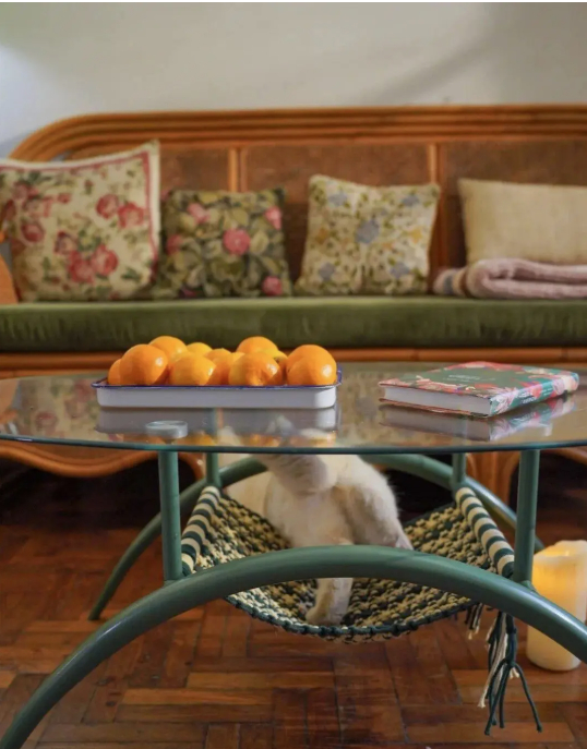 Chưa dừng lại ở đó, bà còn dùng dây cotton đan thêm một tấm lưới bên dưới mặt bàn. Công đoạn này mất gần ba ngày và hàng giờ kiên nhẫn. Kết quả là chiếc bàn trà cũ giờ đây trở thành một chiếc “võng nhỏ” cho mèo nằm. Nhìn đơn giản nhưng lại khiến ai xem cũng bật cười vì quá dễ thương.