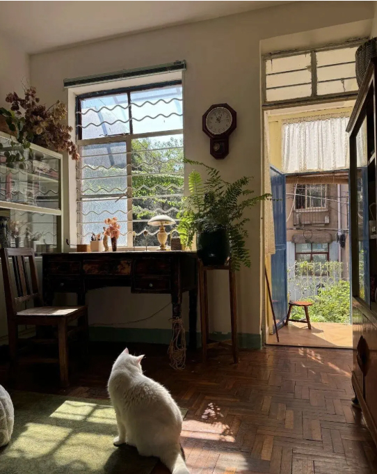Trong nhà bà còn có hai chú mèo trắng. Một con thường cuộn tròn ngủ trong chiếc võng dưới bàn trà, con còn lại thích nằm ở nơi có ánh nắng chiếu vào. Những buổi chiều, bà ngồi đọc sách hoặc uống trà, còn hai chú mèo nằm ngủ gần đó. Khung cảnh bình dị ấy khiến nhiều người nói rằng chỉ nhìn thôi cũng cảm thấy lòng mình dịu lại.