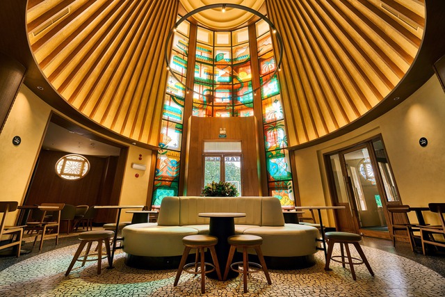 Không chỉ tọa lạc ở vị trí độc đáo, thu hút khách du lịch trong và ngoài nước, cửa hàng này cũng được Starbucks đặc biệt đầu tư về thiết kế. Cửa hàng mới mang đậm dấu ấn giao thoa giữa kiến trúc Pháp cổ và cảm hứng văn hoá Việt – nổi bật với trần nhà mô phỏng nón lá, đường cong Hồ Gươm uyển chuyển, cùng ánh sáng lung linh phản chiếu qua lớp kính màu nghệ thuật. Đặc biệt, khu vực ngoài trời là điểm dừng chân lý tưởng để bạn nhâm nhi cà phê và thả mình vào khung cảnh phố cổ đậm chất Hà Nội.