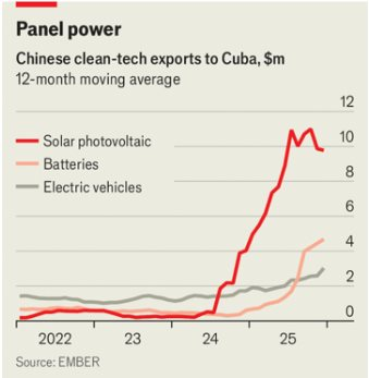 Theo dữ liệu xuất khẩu của Trung Quốc do tổ chức nghiên cứu Ember tổng hợp, trong 12 tháng tính đến tháng 4/2025, lượng tấm pin mặt trời Trung Quốc xuất sang Cuba đã tăng gấp 34 lần – tốc độ nhanh nhất thế giới. Từ chỗ gần như không có điện mặt trời vài năm trước, Cuba đã xây dựng được công suất đủ để giảm áp lực phần nào từ khủng hoảng nhiên liệu.