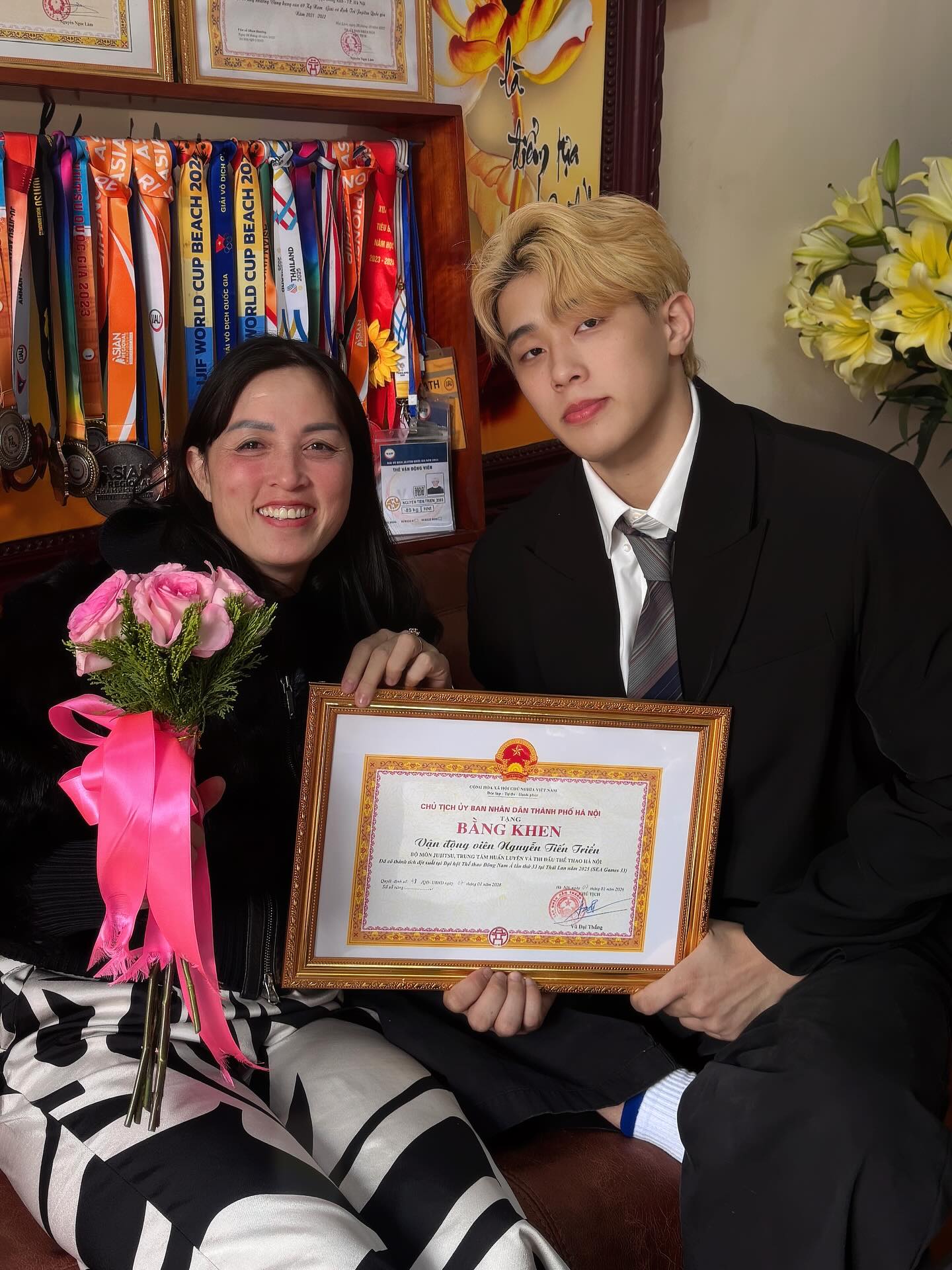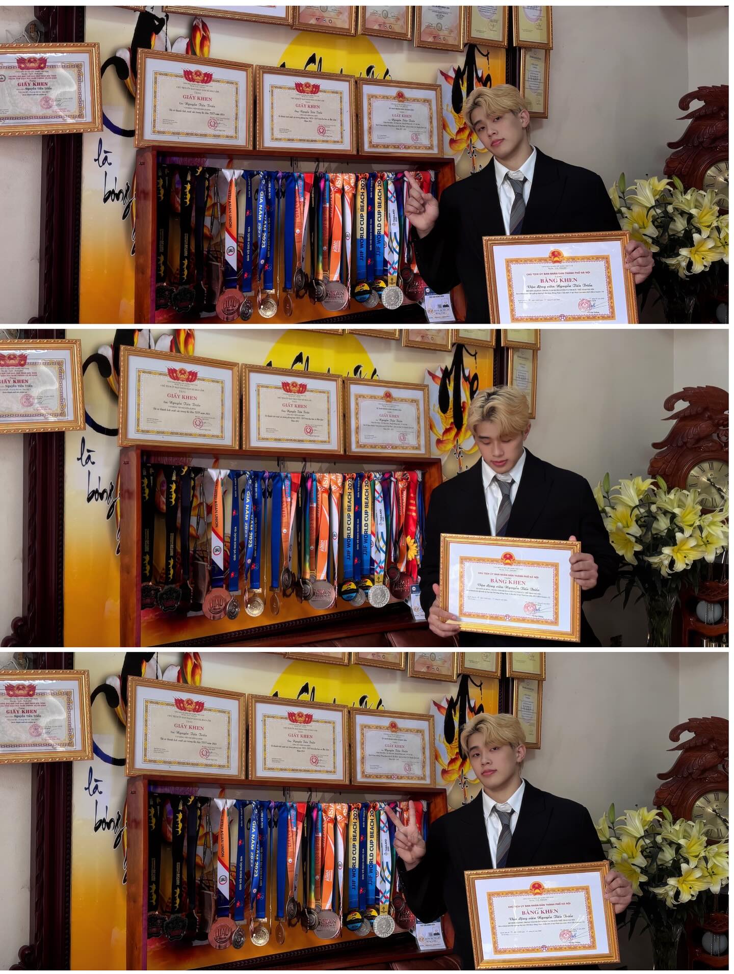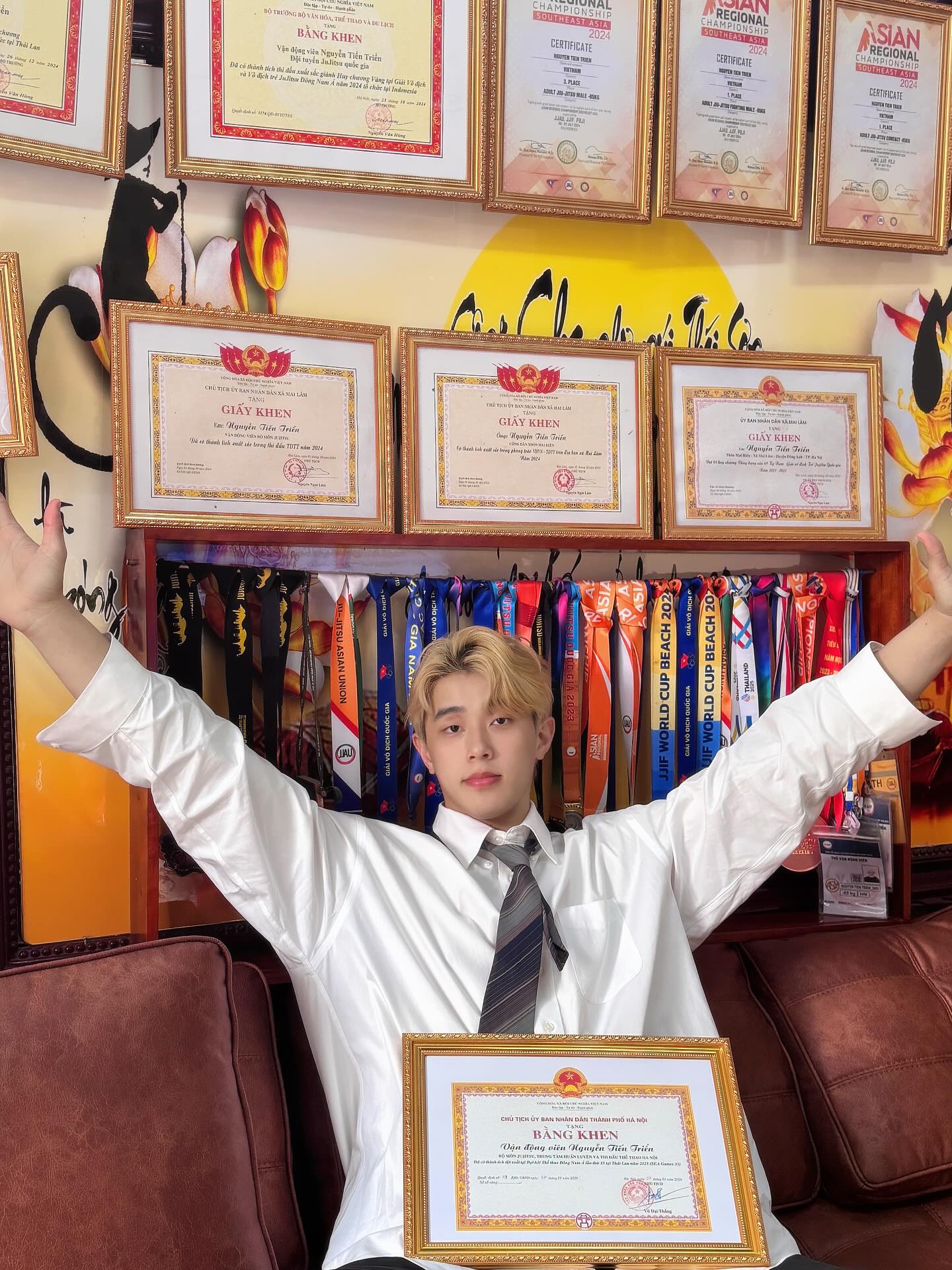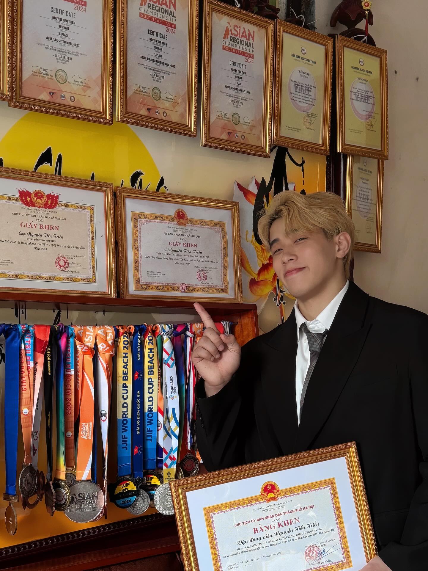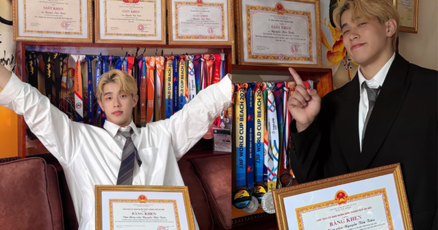 Mới đây, trên trang cá nhân, vận động viên (VĐV) Jujitsu Nguyễn Tiến Triển đã chia sẻ khoảnh khắc tổng kết năm 2025. Trong trang phục sơ mi trắng và vest lịch lãm, nam VĐV sinh năm 2003 khoe trọn vẻ điển trai cùng mái tóc bạch kim thương hiệu. Tuy nhiên, tâm điểm thu hút sự chú ý lại chính là bức tường phía sau, nơi treo kín những tấm huy chương và bằng khen danh giá mà anh đã nỗ lực gặt hái được trong suốt thời gian qua.