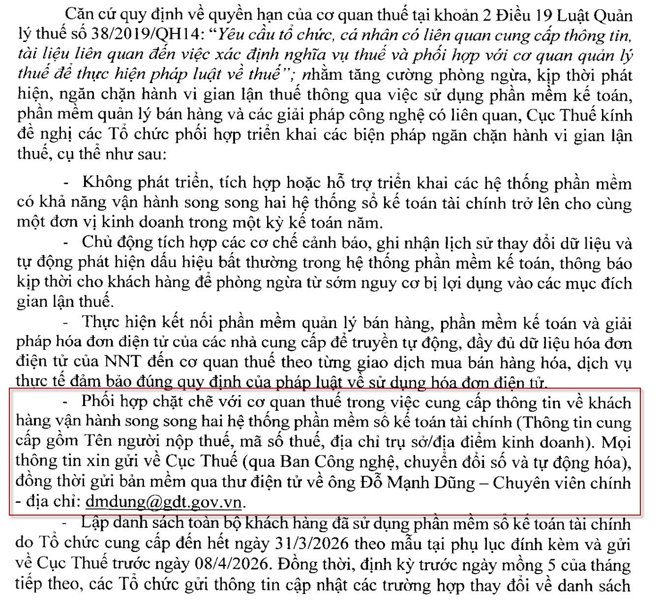 Đặc biệt, chậm nhất đến ngày 08/04/2026 , các nhà cung cấp phải gửi toàn bộ danh sách khách hàng đang sử dụng phần mềm kế toán của mình về Cục Thuế. Sau cột mốc này, định kỳ trước ngày mùng 5 hàng tháng, các đơn vị phải tiếp tục báo cáo cập nhật danh sách khách hàng mới để cơ quan chức năng dễ dàng kiểm soát và truy vết.
