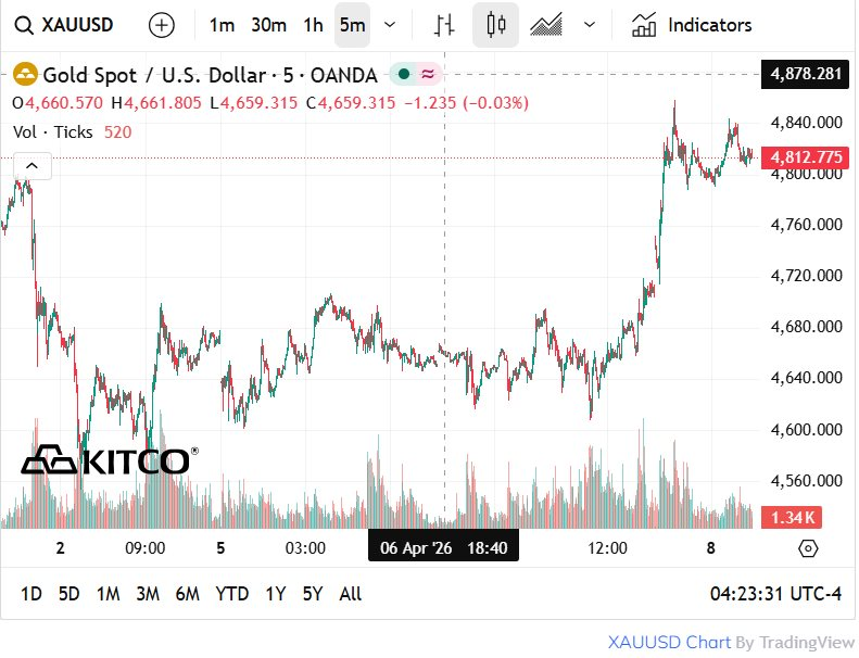 Chiều ngày 8/4/2026, giá vàng và bạc thế giới đồng loạt tăng vọt. Đà tăng được kích hoạt ngay sau khi thông tin về lệnh ngừng bắn hai tuần giữa Mỹ và Iran được công bố, giải tỏa phần nào áp lực căng thẳng tại eo biển Hormuz.