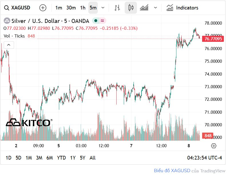 Cùng chiều với vàng, thị trường bạc chứng kiến sự hồi phục mạnh mẽ. Theo LiveMint và TradingView, giá bạc giao ngay đã tăng tới gần 7%, hiện giao dịch tại mức 76,08 USD/ounce, có thời điểm tiệm cận mốc 77 USD/ounce. Tại Việt Nam, bạc Phú Quý hiện có giá gần 79,5 triệu đồng/kg mua vào, 77 triệu đồng/kg bán ra, tăng 6,8% so với phiên ngày hôm qua.