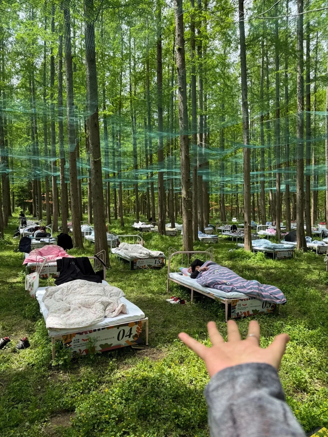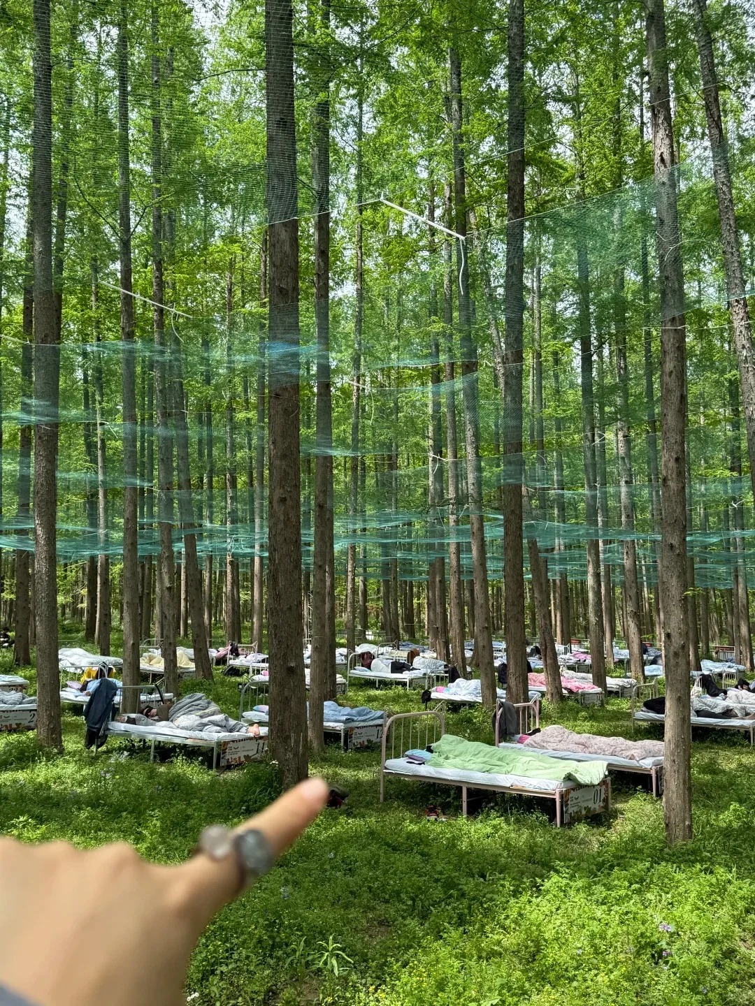 Một chủ tài khoản Xiaohong đã đến tận khu rừng - nơi đang tổ chức cuộc thi ngủ, chụp ảnh lại và đăng tải lên mạng xã hội, vì thấy wow quá đi.