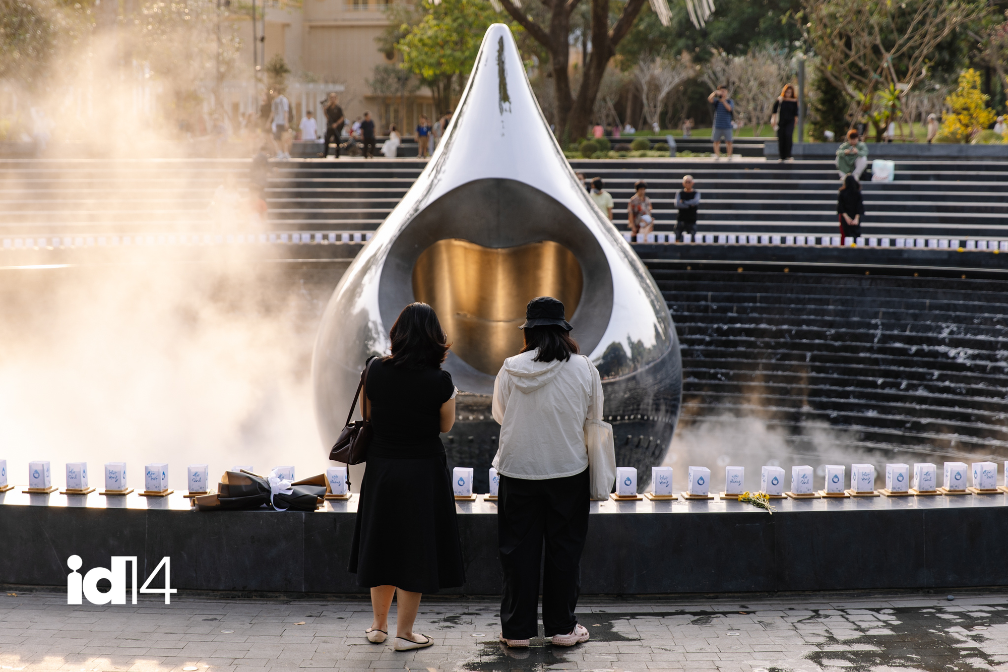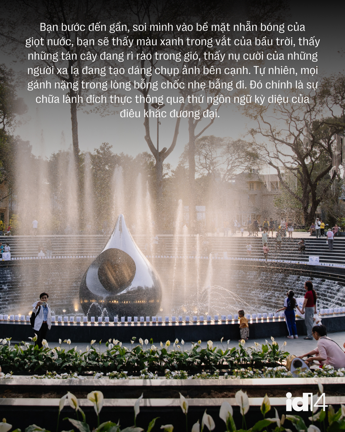 Tuy nhiên, điều khiến tôi dành một sự yêu mến đặc biệt cho công viên này chính là ý nghĩa thiêng liêng mà nó mang lại. Đó là cách những khối óc sáng tạo chọn tiếp cận nỗi đau bằng ngôn ngữ của nghệ thuật đương đại. Thay vì dựng lên một khối bê tông xám xịt, nặng nề, dễ sa vào việc áp đặt những cảm xúc u uất lên người thưởng lãm, họ đã chọn chất liệu inox gương phản chiếu để tạo hình dáng giọt nước. Theo như những lời chia sẻ đầy tâm huyết từ đơn vị thiết kế, hình tượng giọt nước mắt khuyết này mang một ý niệm vô cùng sâu sắc về lòng trắc ẩn của con người. Nó đóng vai trò là một đài tưởng niệm thiêng liêng dành cho những nạn nhân đã không may qua đời trong đại dịch Covid 19, một ký ức đầy đau thương mà thành phố này sẽ không bao giờ quên. Quá trình thai nghén và hoàn thiện biểu tượng nghệ thuật này còn có sự chung tay đóng góp ý tưởng quý báu từ nhà điêu khắc gạo cội Phạm Văn Hạng, một cái tên bảo chứng tuyệt đối cho tính nghệ thuật nghiêm túc và tầm vóc của công trình.
