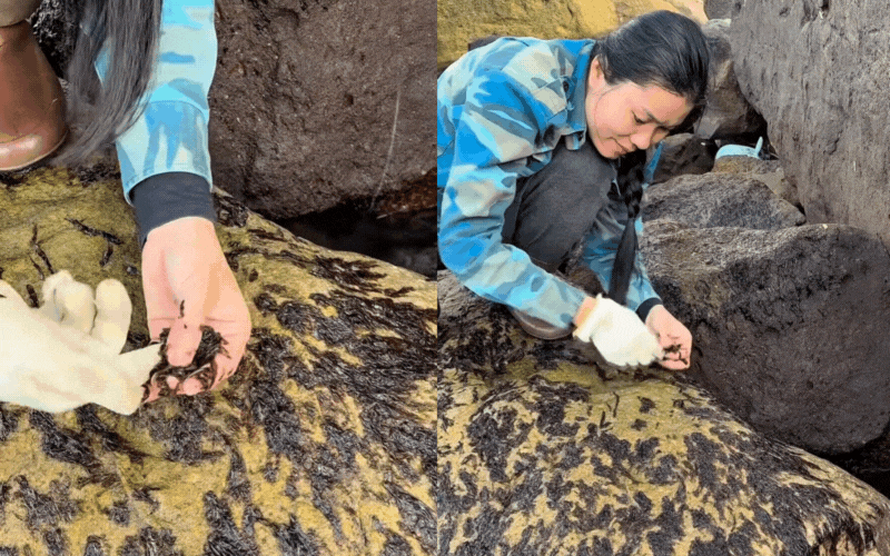 Cái tên "rong mứt" nghe thì ngọt sớt nhưng hành trình thu hoạch nó lại "đắng cay" không hề dễ dàng. Để hái được nắm rong, người dân phải vật lộn với những vách đá trơn như mỡ, sơ sẩy một chút là "ăn trầu" như chơi. Tiktoker Chuyện Thi chia sẻ, dù có trang bị đủ bao tay, dao cạo hay kinh nghiệm đầy mình thì việc thu hoạch vẫn cực kỳ tốn công vì rong bám rất lì. Có khi đứng phơi mình giữa gió rét và sóng tạt suốt 2 tiếng đồng hồ, thành quả thu về cũng chỉ vừa đủ một bữa cơm gia đình.