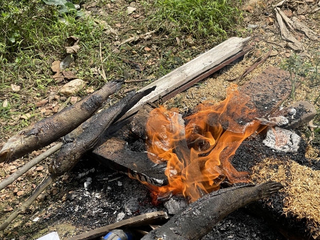 Khi nướng, lá sim được cho trực tiếp lên bếp than. Khói từ lá sim tỏa ra mùi thơm nhẹ, thấm dần vào lớp da cá. Nhờ vậy, cá nướng không chỉ giảm bớt mùi tanh mà còn mang một hương vị rất riêng, gợi cảm giác của núi rừng.