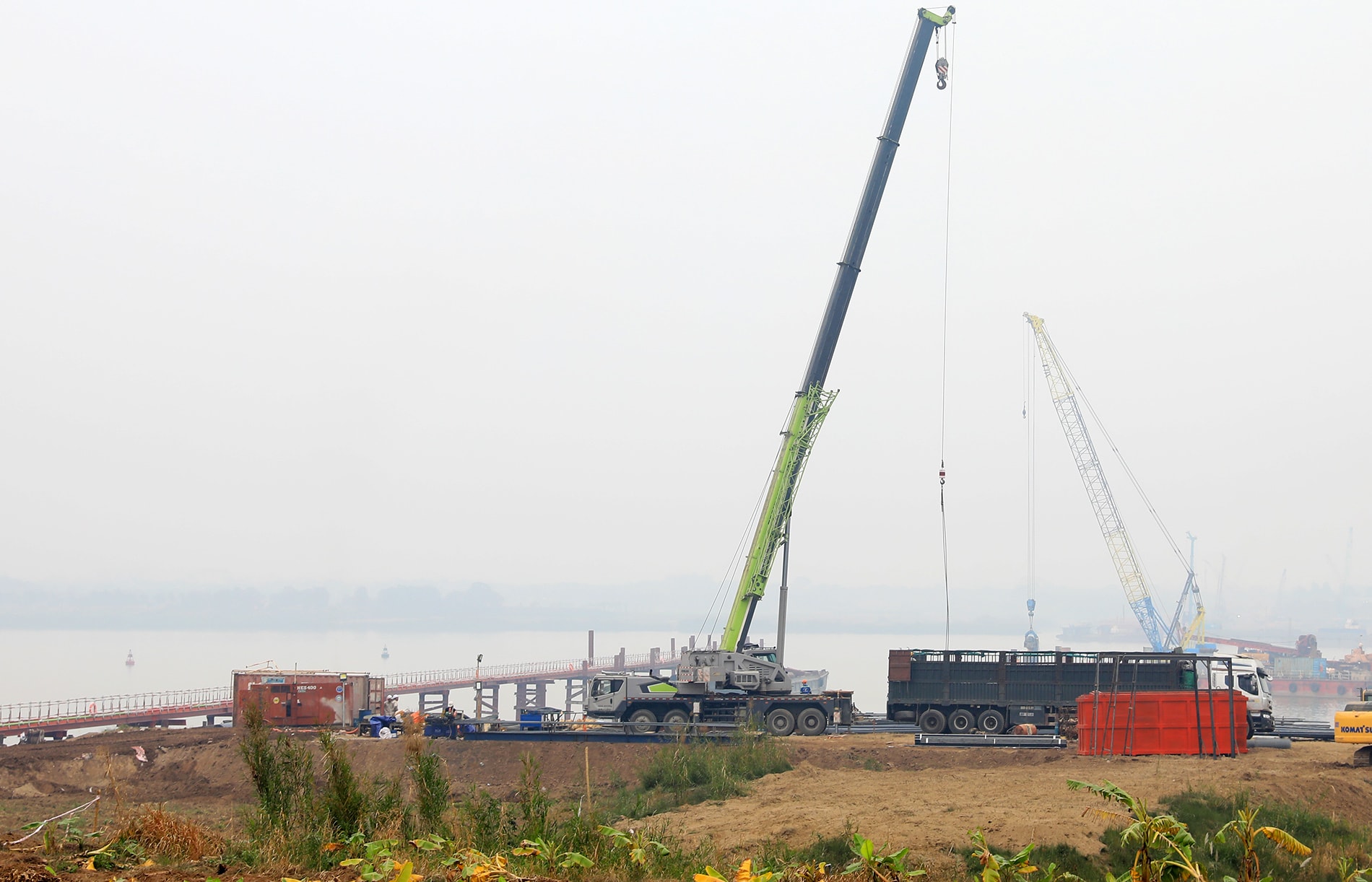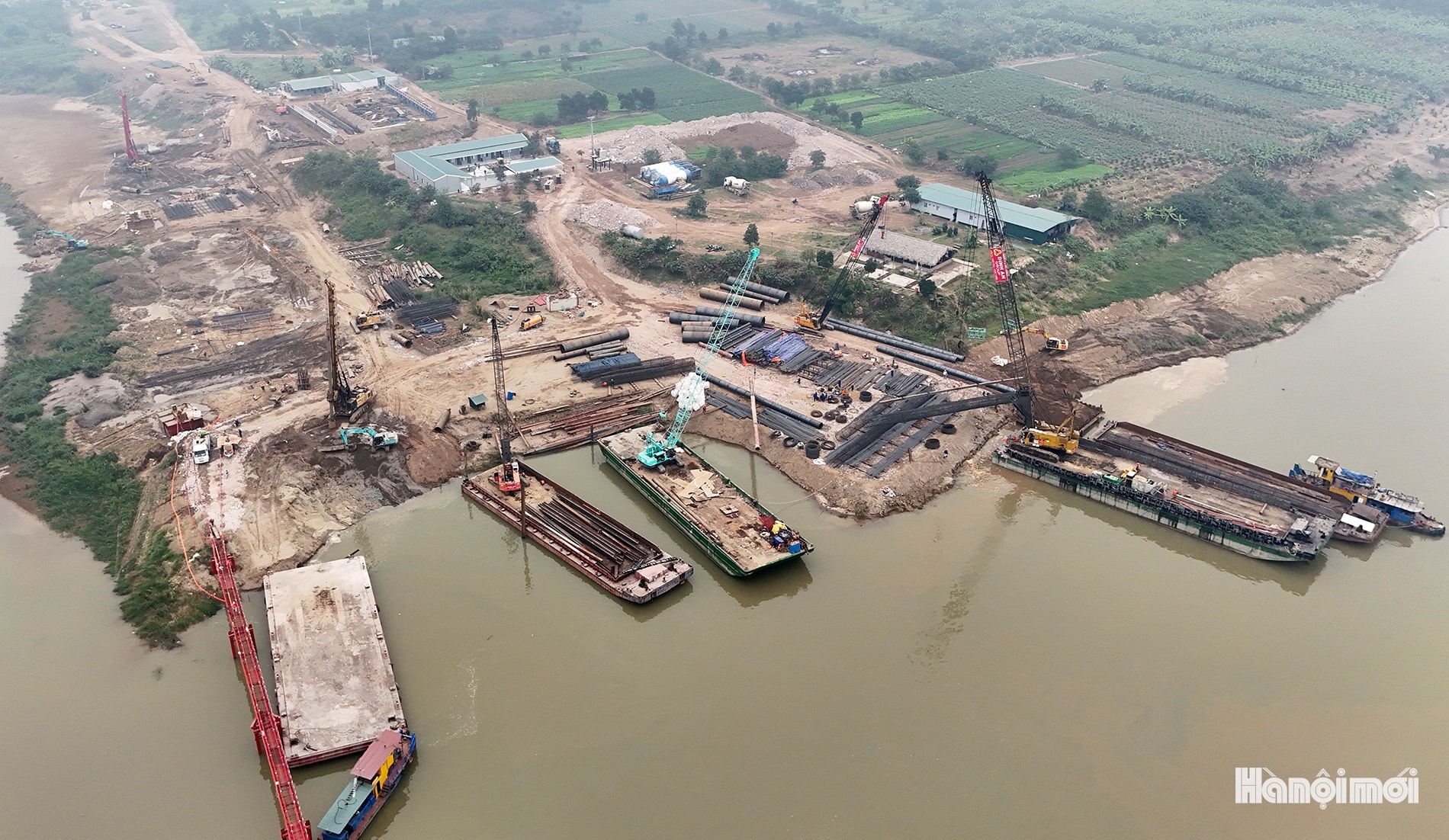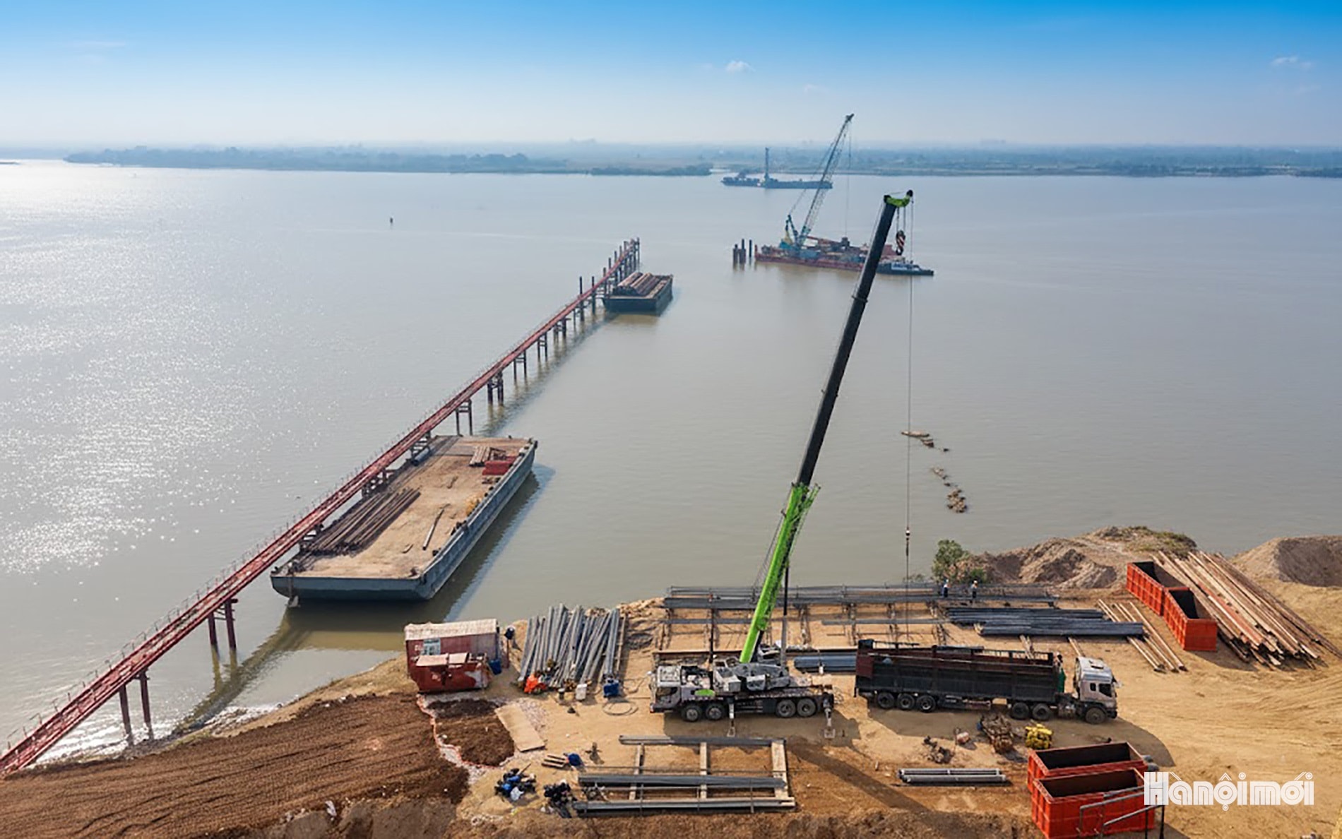 Máy móc, nhân lực của nhà thầu đang tích cực thi công cầu Thượng Cát thuộc Dự án đầu tư xây dựng cầu Thượng Cát và đường hai đầu cầu.