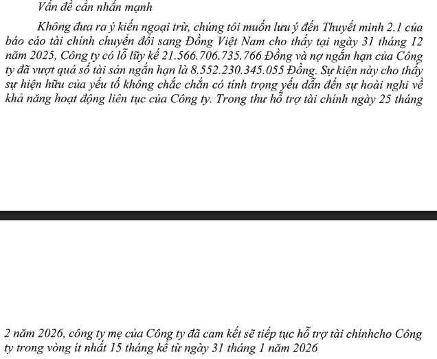 Kiểm toán viên nhấn mạnh sự hoài nghi về khả năng hoạt động liên tục của doanh nghiệp