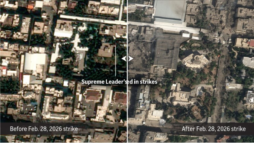 Hình ảnh vệ tinh từ hãng Airbus cho thấy khói đen bốc lên từ khu phức hợp của nhà lãnh đạo tại Tehran sau cuộc tấn công. Các bức ảnh cho thấy nhiều tòa nhà trong khuôn viên đã bị hư hại nghiêm trọng sau đợt không kích.