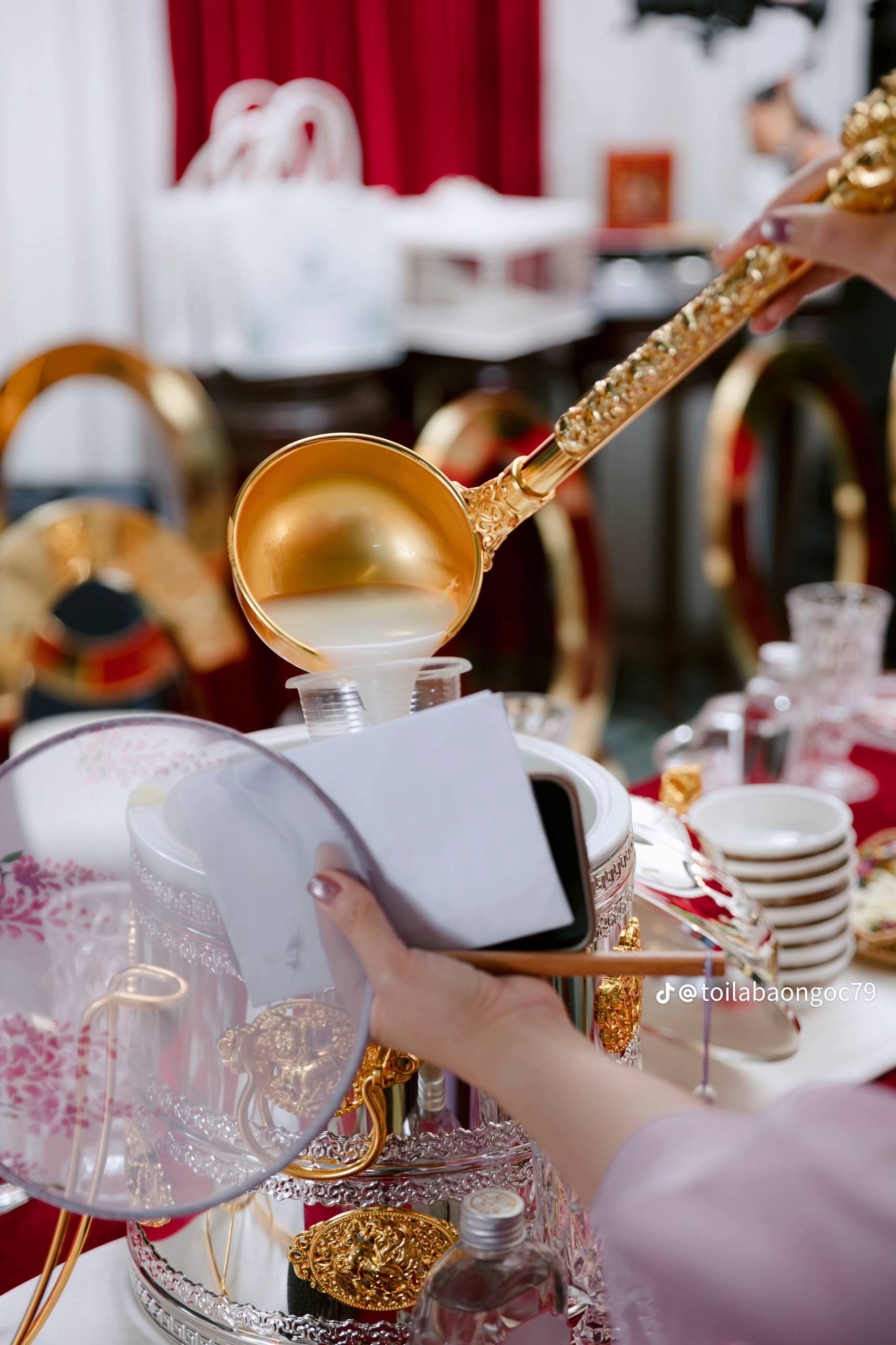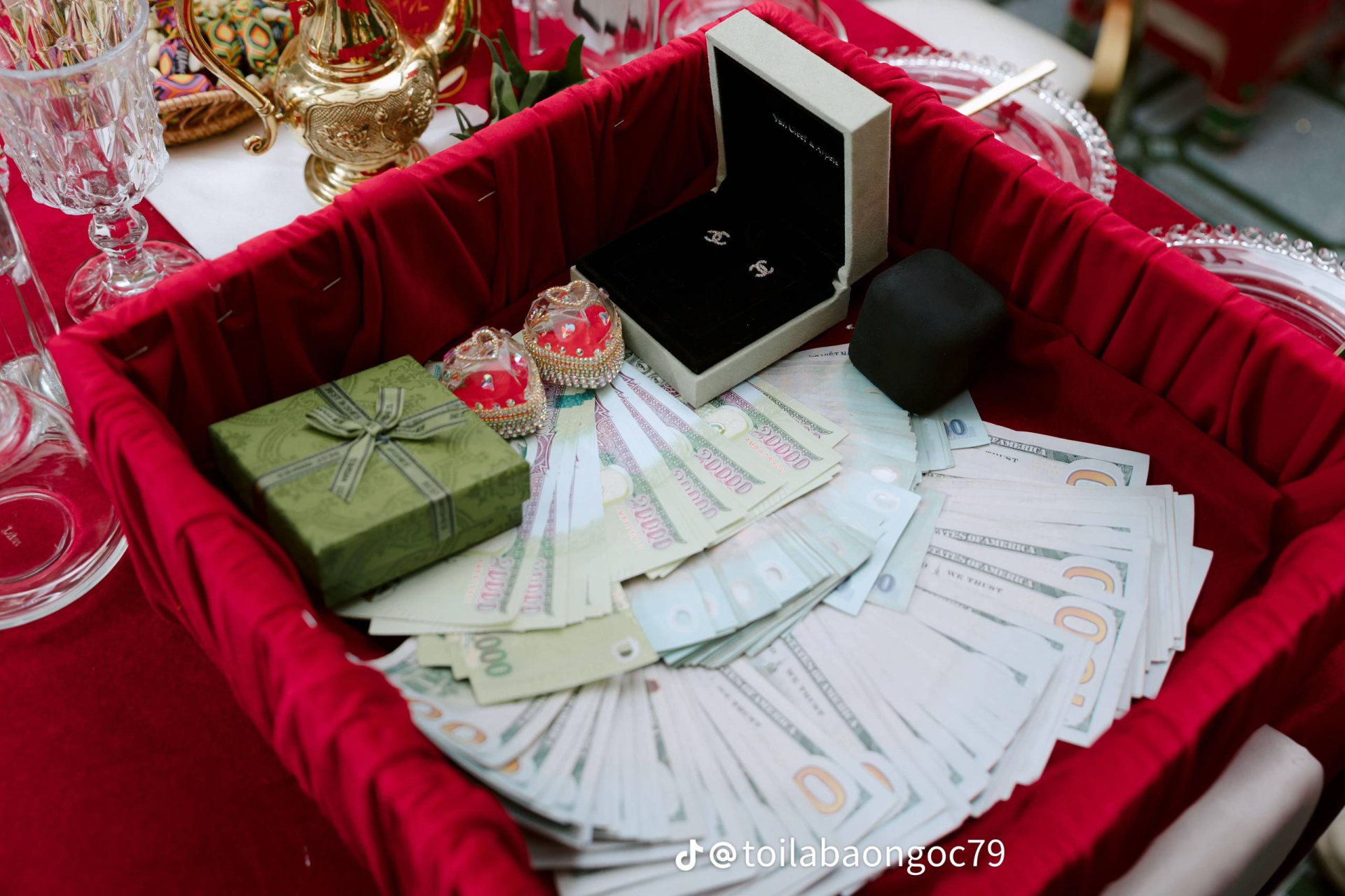 Điều khiến nhiều người đặc biệt quan tâm chính là mâm sính lễ trong ngày hỏi cưới. Nhà trai chuẩn bị tổng cộng 12 tráp lễ, trong đó có 6 tráp theo phong tục Việt Nam với trầu cau, trái cây, rượu, bánh mứt và heo quay. Trong đó là sáu đáp lễ mang đậm bản sắc Mông Cổ gồm các sản phẩm từ sữa bò, trang sức, vàng bạc, đồ thủ công biểu trưng cho thảo nguyên. Ngoài ra, chú rể còn chuẩn bị riêng một giáp lễ với đôi giày hàng hiệu dành tặng cô dâu, khiến nhiều người không khỏi trầm trồ.