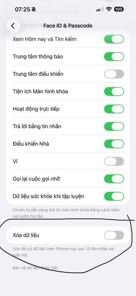 Đây là tính năng "Xóa dữ liệu" (Erase Data) trong phần cài đặt Face ID & Passcode trên iPhone. Khi được bật, iPhone sẽ tự động xóa toàn bộ dữ liệu sau 10 lần nhập sai mật mã liên tiếp. Đây là cơ chế bảo mật được Apple thiết kế để bảo vệ thông tin cá nhân trong trường hợp điện thoại rơi vào tay kẻ xấu.