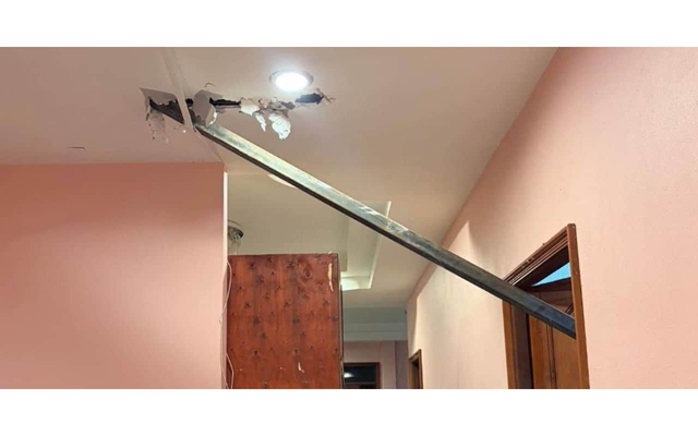 Sự việc xảy ra vào đêm thứ Tư, ngày 14 tháng 1 vừa qua. May mắn thay, không có ai bị thương. Chủ nhà là một phụ nữ đã chia sẻ video về vụ việc gây sốc này trên mạng xã hội, cho thấy một thanh thép dài xuyên qua mái nhà của cô vào khoảng 8 giờ tối.