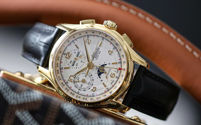 Nổi bật trên mặt số trắng là những cọc số và kim chỉ giờ màu vàng được hoàn thiện thủ công, cùng chi tiết lịch tuần trăng (Moonphase) – một tính năng độc đáo, vừa chính xác vừa thi vị, đưa nhịp điệu của vũ trụ thu nhỏ trên cổ tay.