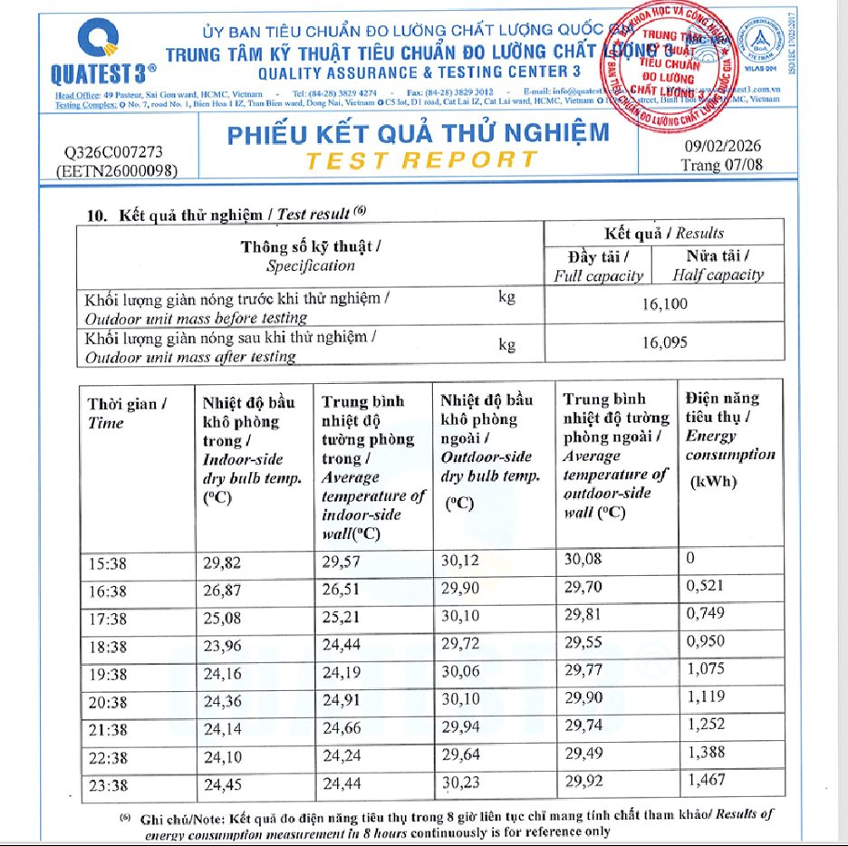 Điều kiện đo kiểm là nhiệt độ môi trường 30 độ C, nhiệt độ cài đặt điều hòa 26 độ C và giả lập trong phòng có 2 người lớn nghỉ ngơi. Ảnh chụp kết quả thử nghiệm.