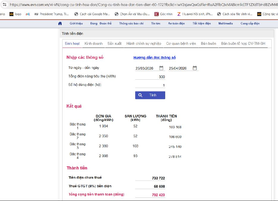 Công cụ tính tiền điện của EVN với gia đình sử dụng 300 kWh điện mỗi tháng. Ảnh: Website EVN.