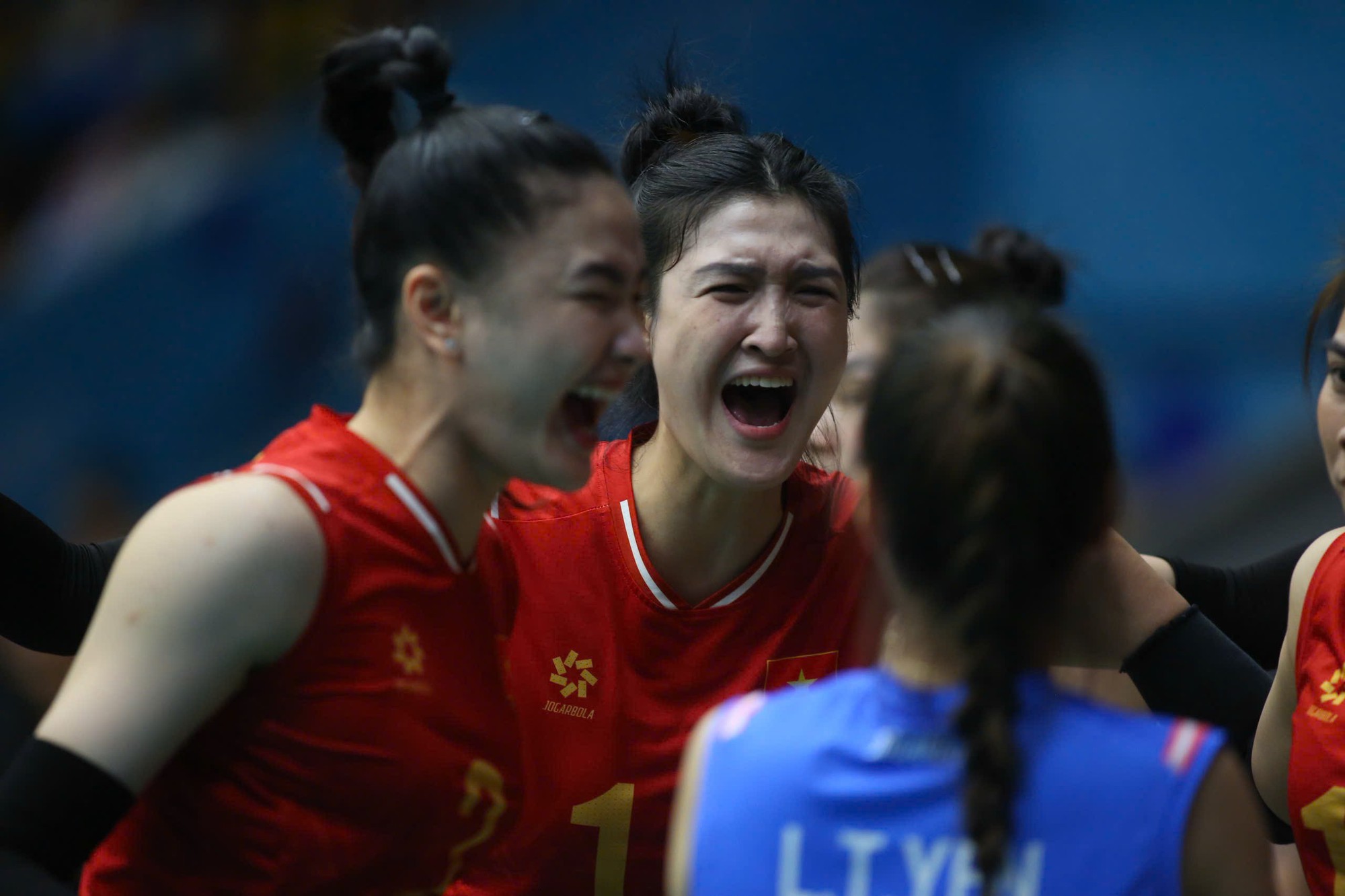 Kết thúc trận đấu, các cô gái tuyển bóng chuyền nữ Việt Nam òa khóc.